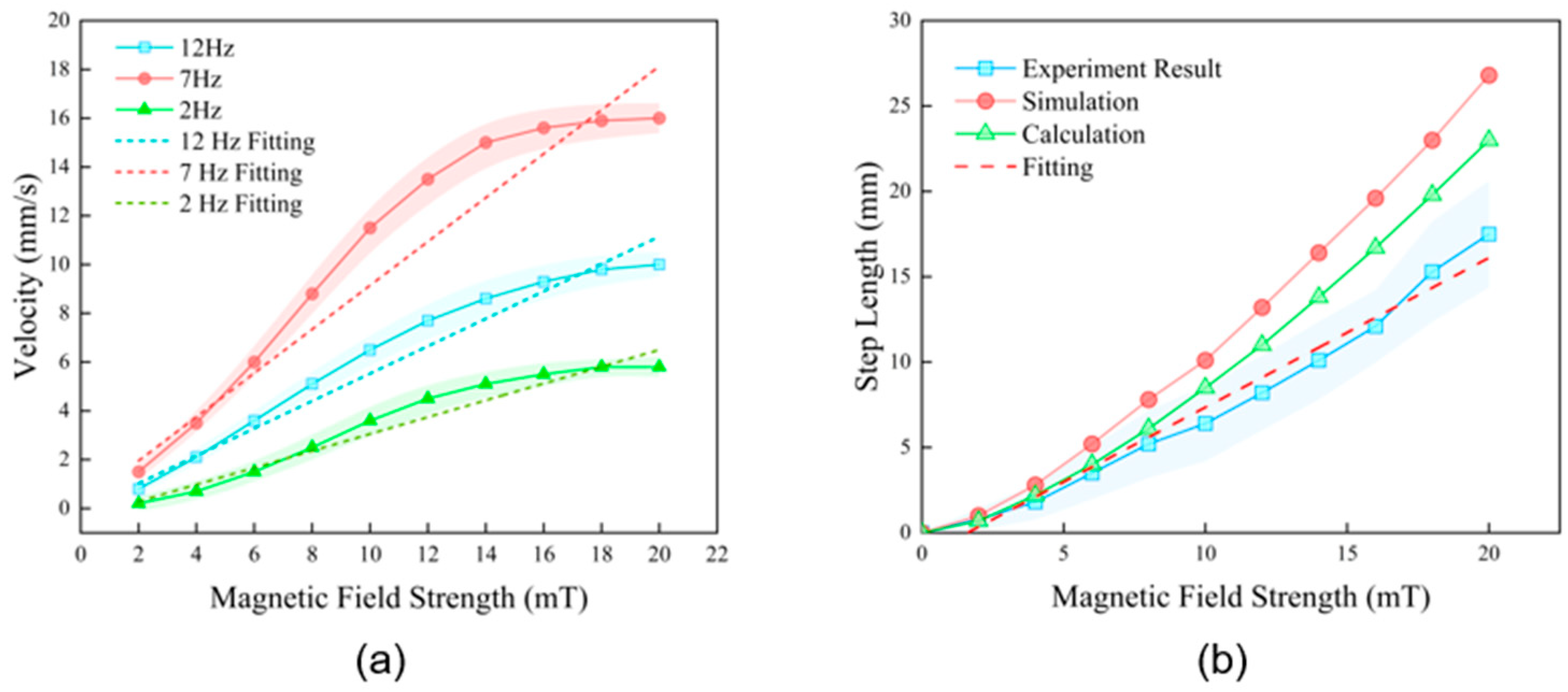 Figure 6b are a comparative relationship between the experimental measurements, theoretical calculations, and numerical simulation predictions. An evident core trend is that, across all three methods, the robot’s step length exhibits a strong positive correlation with the magnetic field strength. This confirms that the robot’s displacement capability can be effectively controlled by tuning the external magnetic field. Concurrently, the overall trends of the three curves show good agreement, mutually validating the reliability of our theoretical framework, numerical simulations, and physical experiments.
