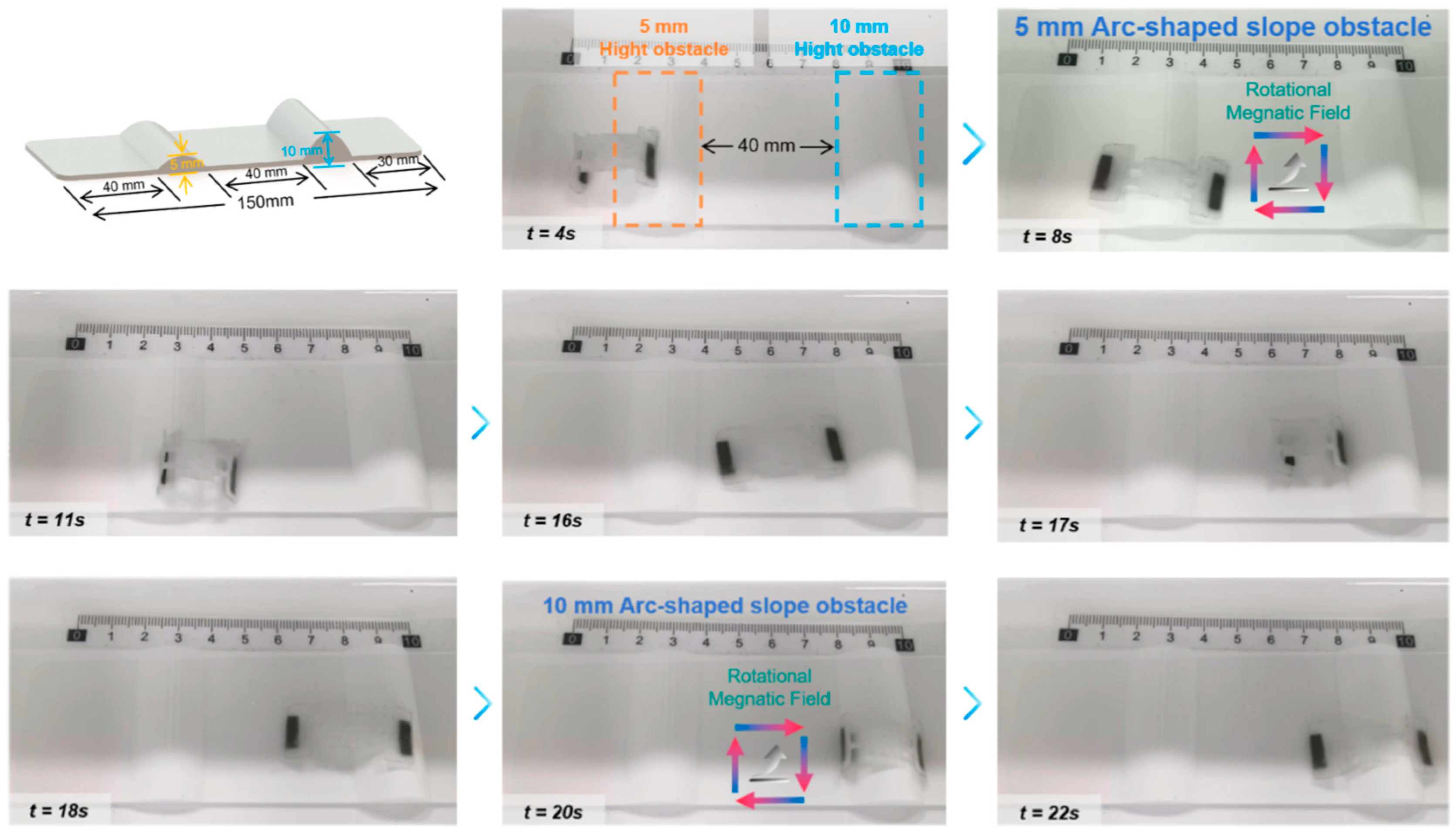 Figure 5a that, across the entire tested range, the robot’s bending deformation increases monotonically and approximately linearly with the magnetic field strength. This measurable static bending amplitude serves as the kinematic basis for the robot’s ‘high-lifting’ gait, enabling the clearance height demonstrated in later obstacle experiments.