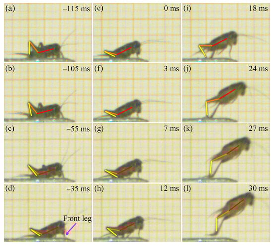 Crickets (Orthoptera, Gryllidae) are notable for their exceptional agility and jumping capability [9,10]. In China, there has been a traditional culture of crickets fighting since the Song dynasty (AD 960–1279) [11]. Fighting crickets Velarifictorus micado exhibit remarkable jumping performance and can maintain postural stability during the aerial phase, without any aerodynamic assistance from the wings. The researchers explored the functional importance of the hind legs in crickets, particularly in the context of their locomotor and survival behaviors [12,13,14,15,16]. Through a combination of experimental, theoretical, and finite element analyses, Xing and Yang [17] elucidated that V. micado dynamically manipulate aerodynamic force through strategic adjustments of their hind legs during the aerial phase, enhancing jumping stability and cushioning landings. Nevertheless, the jumping kinematics and performance of the crickets during the take-off phase are not fully understood.