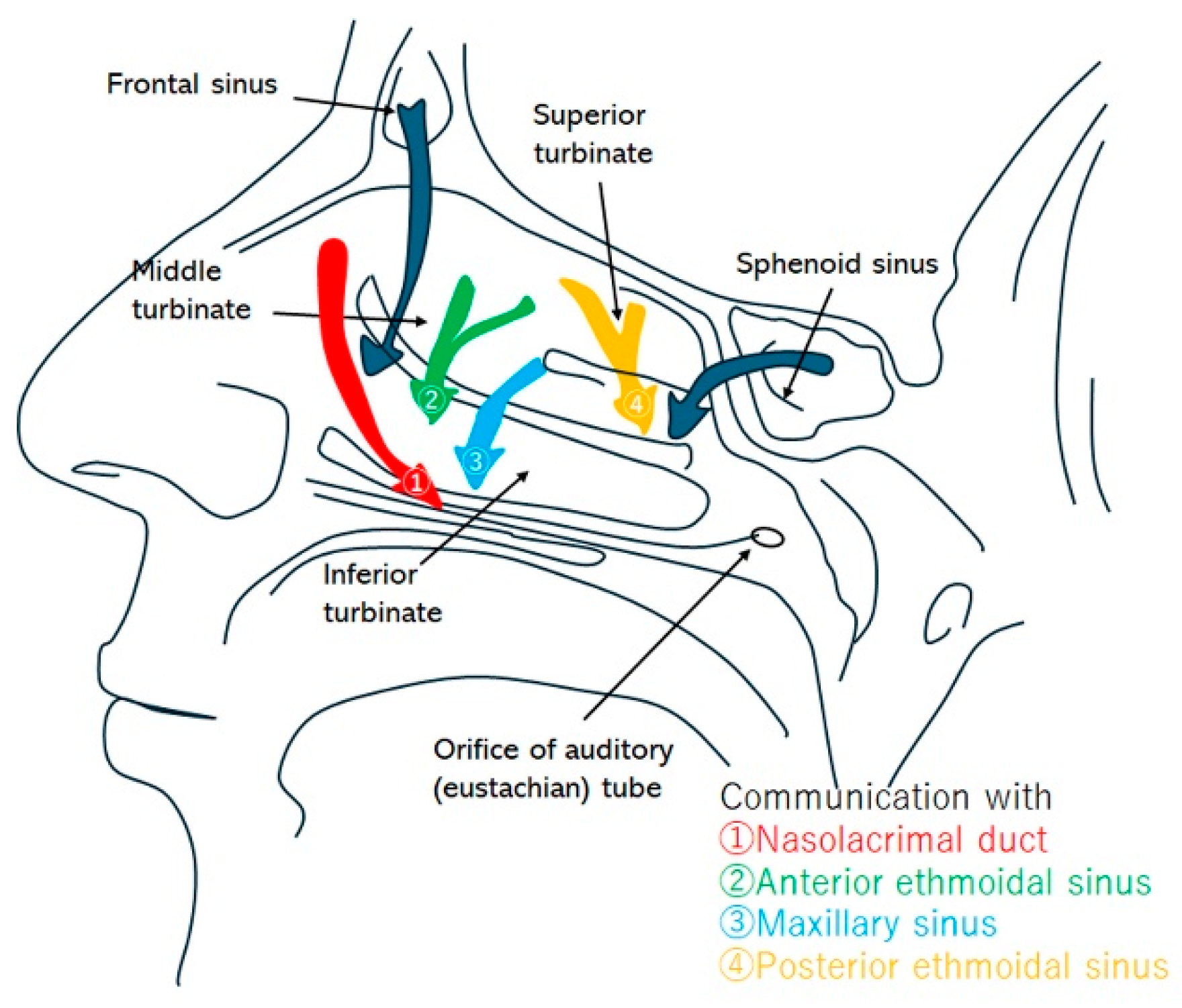 | Posterior ethmoid air cells | Superior meatus (and supreme when present) → sphenoethmoid recess → nasal cavity → nasopharynx | Several small ostia (<2 mm each) |