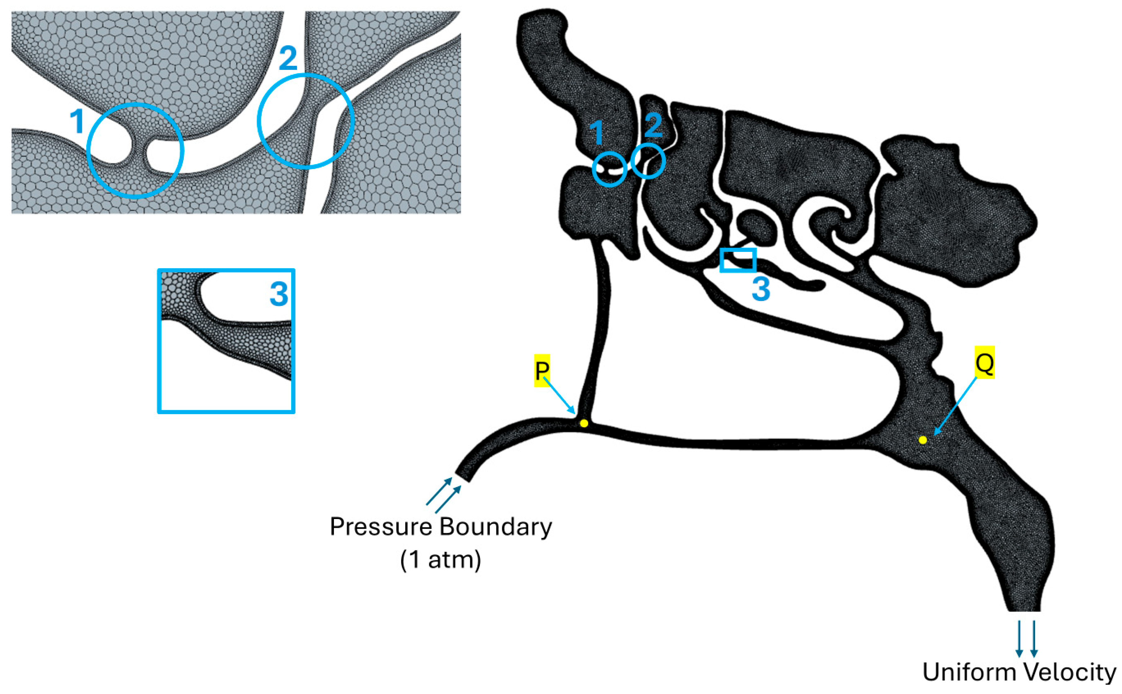 - Warfield-McAlpine, P.; Fletcher, D.F.; Zhang, F.; Inthavong, K. Increasing Airflow Ventilation in a nasal maxillary ostium using optimised shape and pulsating flows. Biomech. Model. Mechanobiol. 2025, 24, 1343–1362. [Google Scholar] [CrossRef]