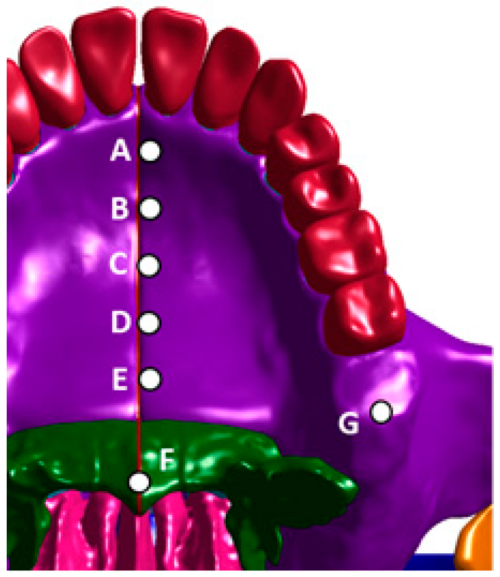 - Lee, H.K.; Bayome, M.; Ahn, C.S.; Kim, S.H.; Kim, K.B.; Mo, S.S.; Kook, Y.-A. Stress distribution and displacement by different bone-borne palatal expanders with micro-implants: A three-dimensional finite-element analysis. Eur. J. Orthod. 2014, 36, 531–540. [Google Scholar] [CrossRef] [PubMed]