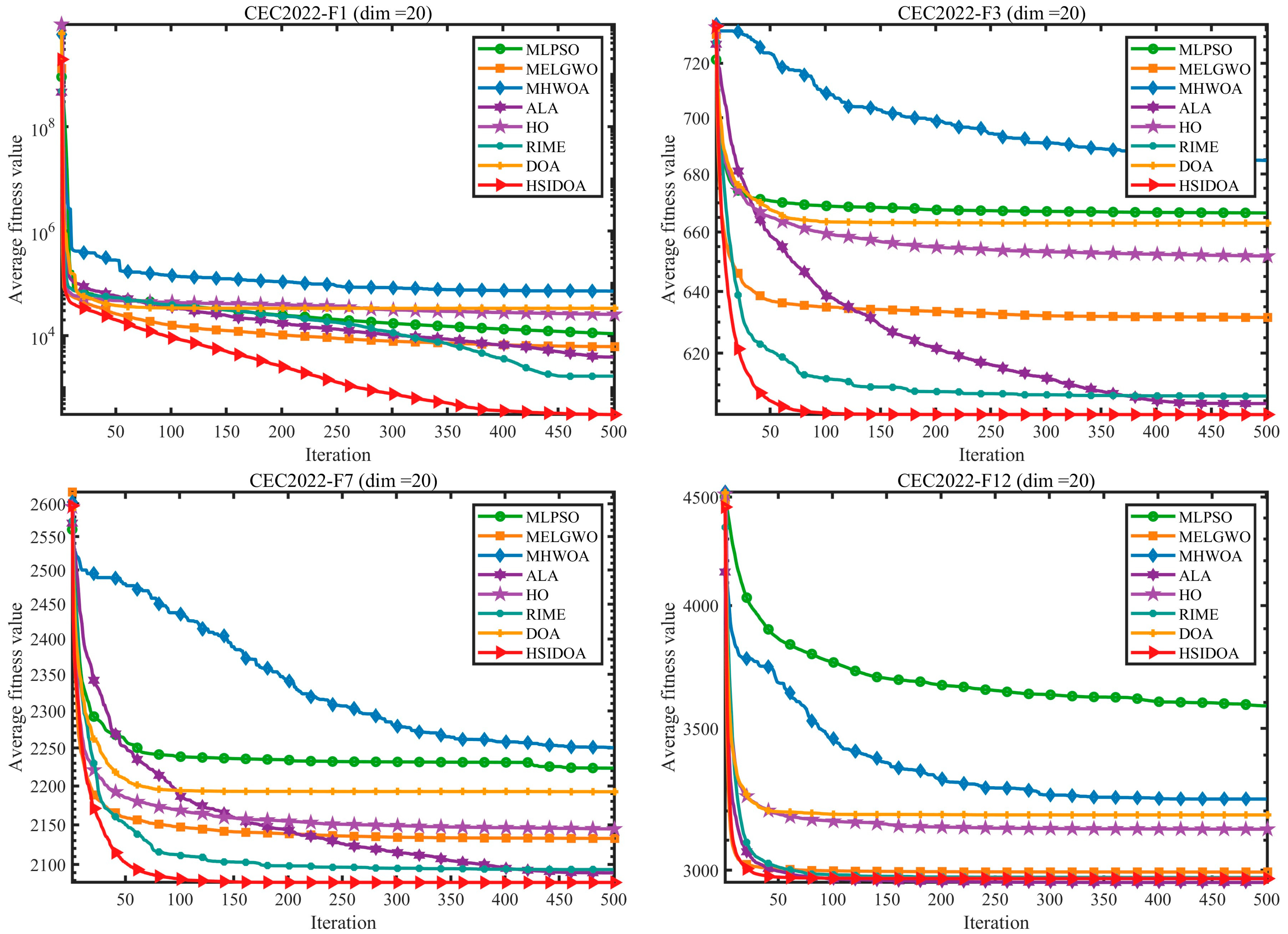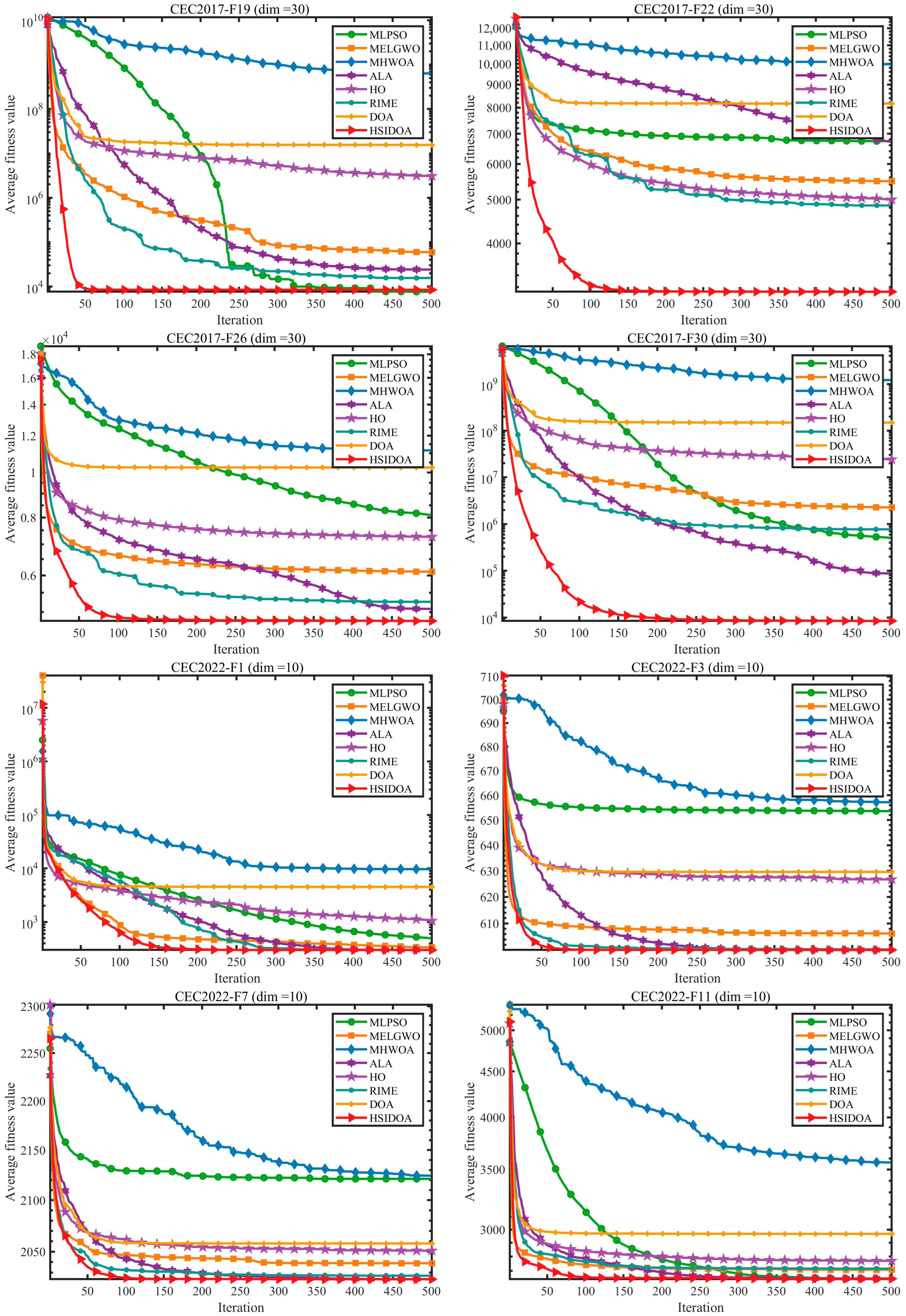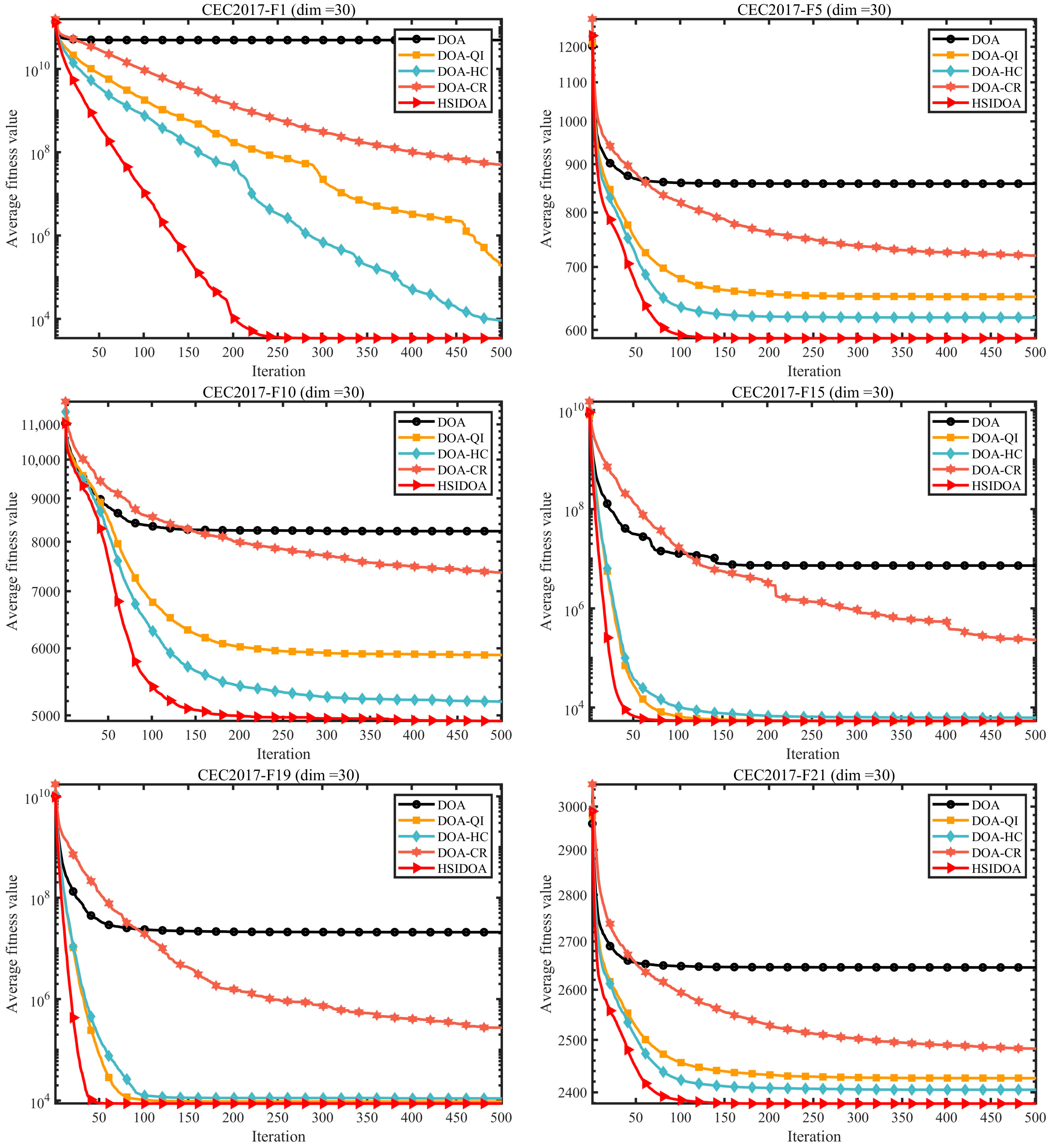 - Extensive experiments on the CEC2017 and CEC2022 benchmark suites are conducted to comprehensively validate the superiority of HSIDOA.