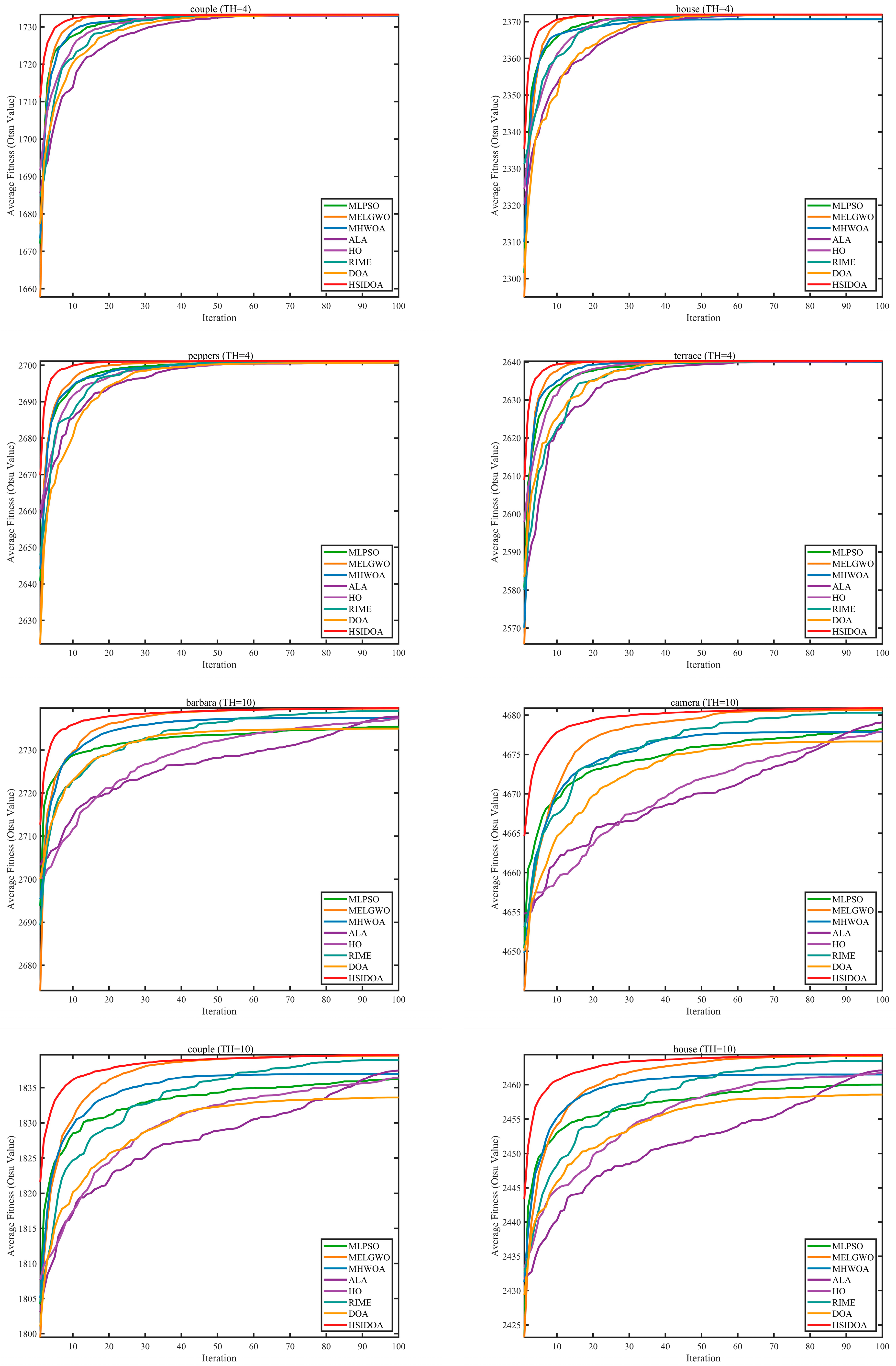 | Images | TH | Metrics | MLPSO | MELGWO | MHWOA | ALA | HO | RIME | DOA | HSIDOA |