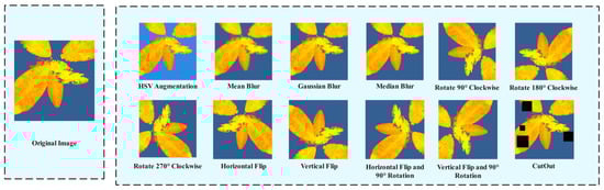 To further enhance the model’s robustness and generalization ability, and to better extract drought stress features in tea leaves, this study applied data augmentation techniques to the entire dataset, including HSV spatial disturbance, Mean Blur, Gaussian Blur, Median Blur, CutOut, D4 (dihedral group) transformation, and random brightness transformations [28,29], as shown in Figure 1. The HSV spatial perturbation is mainly used to simulate different color temperatures, white balance, and backlighting conditions, reducing the model’s reliance on non-physiological color variations and false color mapping, while enhancing the model’s focus on drought-related features, thereby improving the model’s adaptability to different shooting conditions. Mean Blur is used to simulate the detail degradation caused by slight defocus and resampling. It preserves the large-scale intensity gradient while suppressing high-frequency noise and random particles, thereby improving the recognition accuracy of the model for low-definition images. By approximating the point spread function of the optical system, Gaussian Blur simulates the blur effect caused by defocus or slight motion, and enhances the detection accuracy of the model under the conditions of fast imaging or unstable exposure. Median Blur uses a small-scale convolution kernel for median filtering, which effectively removes salt and pepper noise and hot pixel outlier interference. While maintaining the integrity of the edge structure, it reduces the misjudgment probability of the model for abnormal bright and dark spots. CutOut is used to simulate common occlusions such as mutual occlusion of leaves, identification stickers, and shadow reflection. The number of random occlusions is set to 1–6, and the occlusion area accounts for 5–40% of the original image. On the premise of not changing the topological structure of the image, the D4 transform (rotation and mirror combination) applies rotation and mirror operation to the sample to enhance the generalization ability of the model to different shooting angles and swing habits.