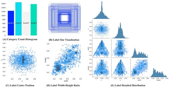 To ensure the objective independence of the test and validation sets, this study adopts the mode of ‘first division and then enhancement’ in the construction of the data set. A total of 4212 augmented images were obtained, with 2691 images in the training set, 676 images in the test set, and 845 images in the validation set. The dataset label visualization is shown in Figure 2. Figure 2A shows the histogram of the distribution of four drought stress labels. Figure 2B shows the width-height distribution of the bounding boxes, with the center of all bounding boxes set at the image center. Figure 2C illustrates the spatial distribution of the center points in the image coordinate system, while Figure 2D shows the distribution of the bounding box aspect ratios. Figure 2E provides a detailed distribution of the drought stress labels in the image [30].