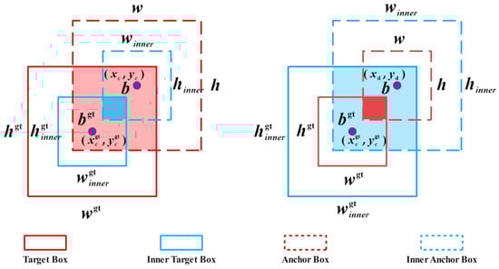 The intersection area of the predicted box and the ground truth box is calculated as shown in Equation (21). It is mainly derived by calculating the maximum and minimum values of the left, right, top, and bottom boundaries of the two boxes to determine the width and height of the intersection area. The union is calculated as shown in Equation (14), which refers to the total area of the Inner Target Box and Inner Anchor Box minus the area of their intersection. The improved loss function is calculated as shown in Equations (22)–(25), where