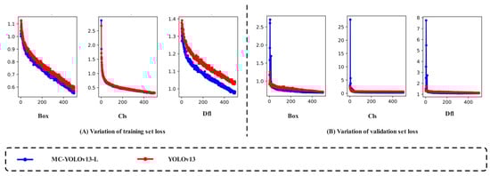 - Compared with YOLOv13 network, Box Loss, Cls Loss, and DFL Loss of MC-YOLOv13-L network decreased by 5.08%, 3.13%, and 4.85%, respectively, in the training set and decreased by 2.82%, 7.32%, and 3.51%, respectively, in the validation set. Furthermore, the improved network demonstrated faster convergence, enhanced stability, and stronger generalization capability.