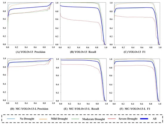 As shown in Figure 8, MC-YOLOv13-L reached 93.03%, 95.01% and 94.01% in terms of accuracy, recall rate and balance score (F1 score), respectively. Compared with the original YOLOv13 model (88.39%, 88.08%, 88.23%), it increased by 4.64, 6.93 and 5.78 percentage points, respectively. In the original YOLOv13 network, the recall for severe drought is significantly lower than for the other three drought levels. The test results indicate that this phenomenon is mainly due to the significant wilting of tea seedling leaves under severe drought conditions, which leads to a noticeable reduction in the visible phenotypic area in chlorophyll fluorescence imaging. After processing with Compound-Eye Apposition Concatenation, the phenotypic area further shrinks, resulting in a lower recall. Compared to the original network, the improved MC-YOLOv13-L network shows a significant increase in recall for severe drought phenotype detection.