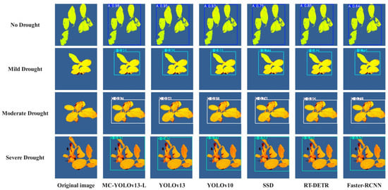 In the drought stress detection task for Yunnan large-leaf tea seedlings, the performance of the model directly determines the accuracy and stability of practical application. To comprehensively evaluate the detection performance of the improved MC-YOLOv13-L in practical tasks, this study selected MC-YOLOv13-L, YOLOv13, YOLOv10, SSD, RT-DETR, Faster-RCNN six target detection networks to carry out comparative experiments. The results are shown in Table 8. Compared to the original YOLOv13 network, YOLOv10, SSD, RT-DETR, and Faster-RCNN, the MC-YOLOv13-L network improved Precision by 4.64%, 6.4%, 17.66%, 6.68%, and 17.79%, respectively. Recall was improved by 6.93%, 7.72%, 14.73%, 10.08%, and 18.99%, respectively. F1 increased by 5.78%, 7.05%, 16.26%, 8.38%, and 18.38%, respectively. mAP@50 was improved by 4.2%, 5.29%, 14.59%, 7.19%, and 17.32%, respectively.