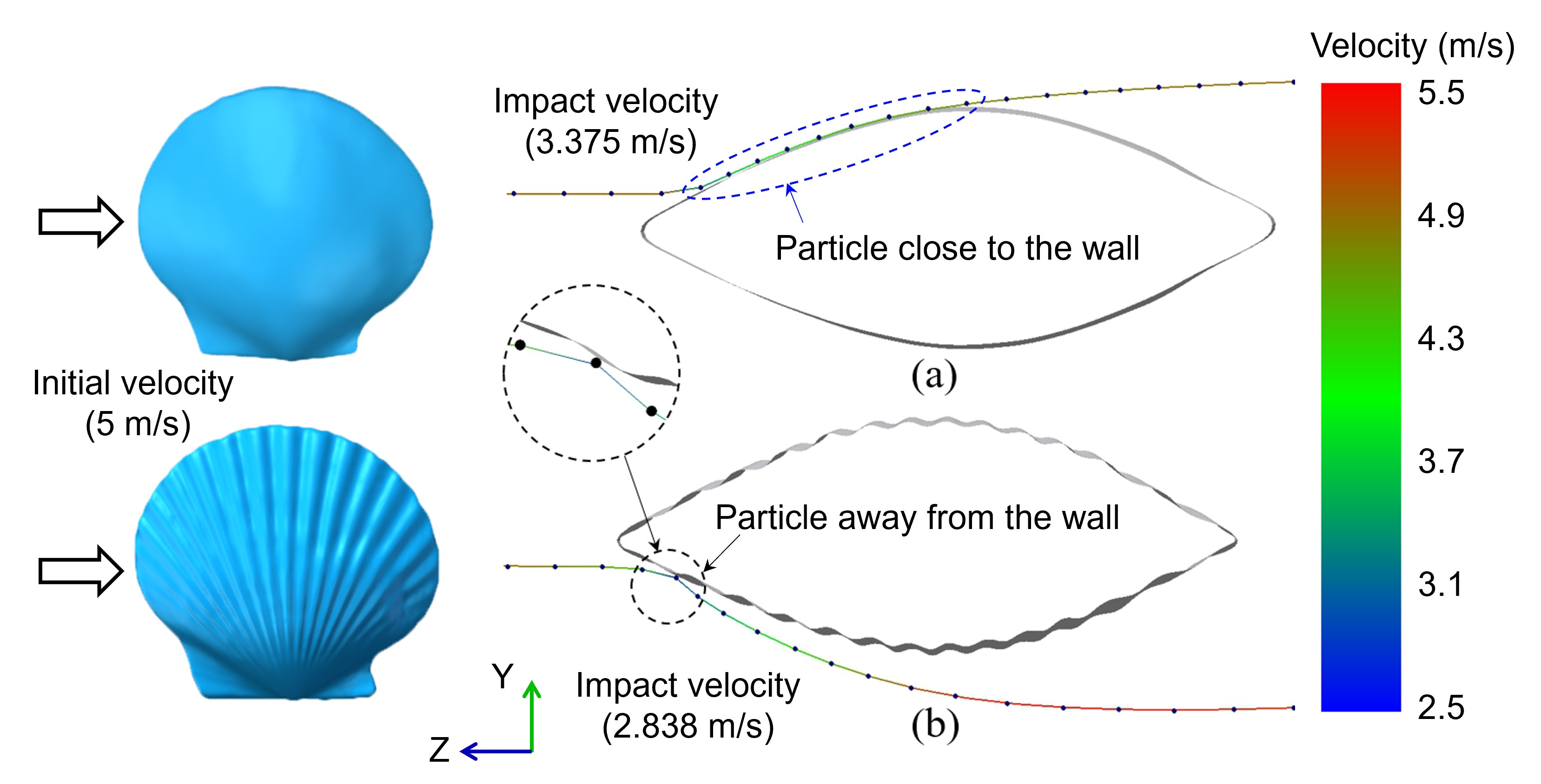 - After hitting the smooth shell wall, particles were found to move downstream along the wall. In contrast, after hitting the ribbed shell, particles were found to move at a certain distance from the wall, and under the action of the high-velocity flow field, the particles could escape the wall at a higher velocity.