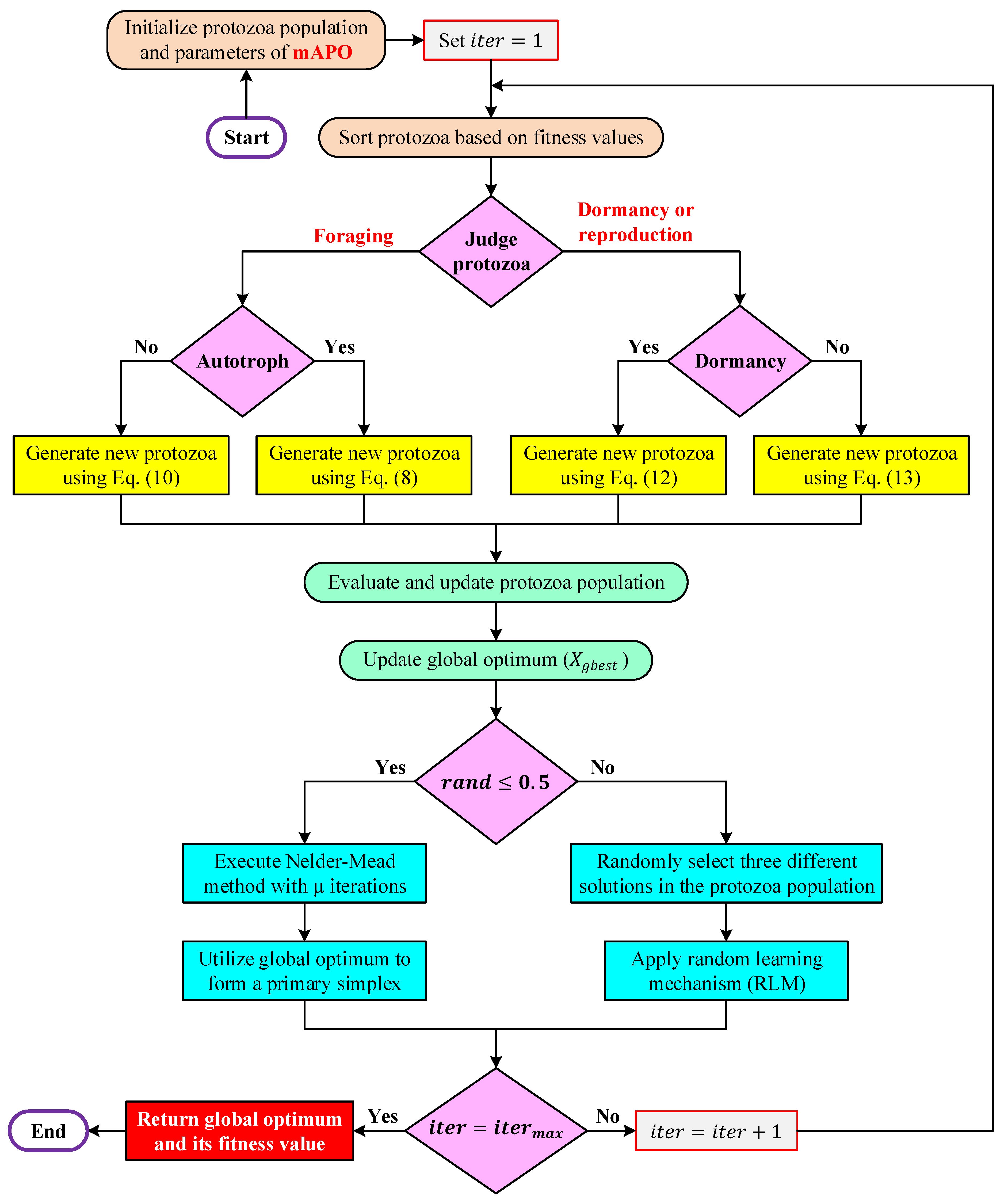 The parameter settings adopted in this study were selected to ensure fairness, stability, and reproducibility, while preserving the intrinsic characteristics of the optimization algorithms under comparison. For the APO and the proposed modified version mAPO, the original control parameters governing foraging, dormancy, reproduction, and behavior-switching probabilities were retained exactly as defined in the canonical APO formulation. This choice was made deliberately to maintain the inherent balance between exploration and exploitation embedded in the original algorithm and to ensure that the performance improvements observed in mAPO arise solely from the introduced random learning strategy and the embedded Nelder–Mead simplex refinement, rather than from extensive parameter retuning. The additional parameters associated with the proposed enhancements were determined based on well-established practices in the metaheuristic optimization literature. In particular, the coefficients used in the Nelder–Mead simplex operations (reflection, expansion, and contraction) were selected according to standard recommendations for derivative-free local search, ensuring stable and efficient local refinement. Similarly, the activation probability of the random learning mechanism was chosen to introduce occasional diversity-enhancing perturbations without disrupting the dominant search dynamics of the population. These settings were fixed across all experiments to avoid problem-specific tuning and to preserve generality.