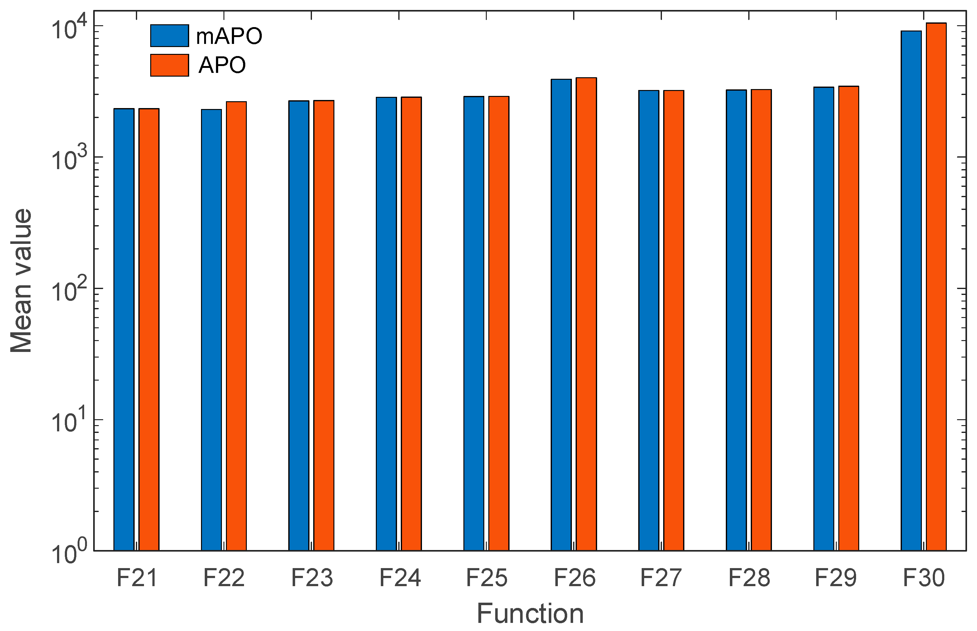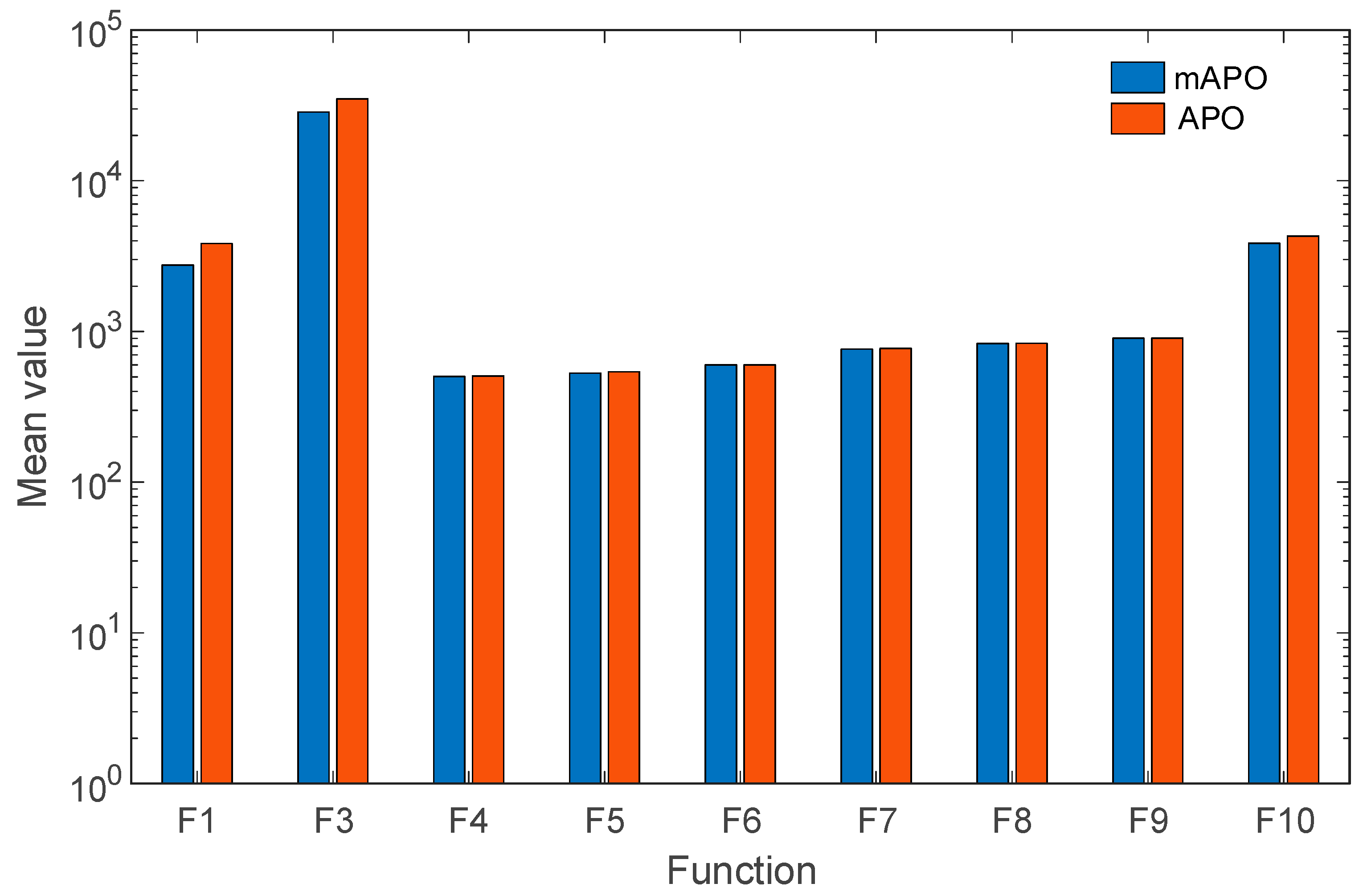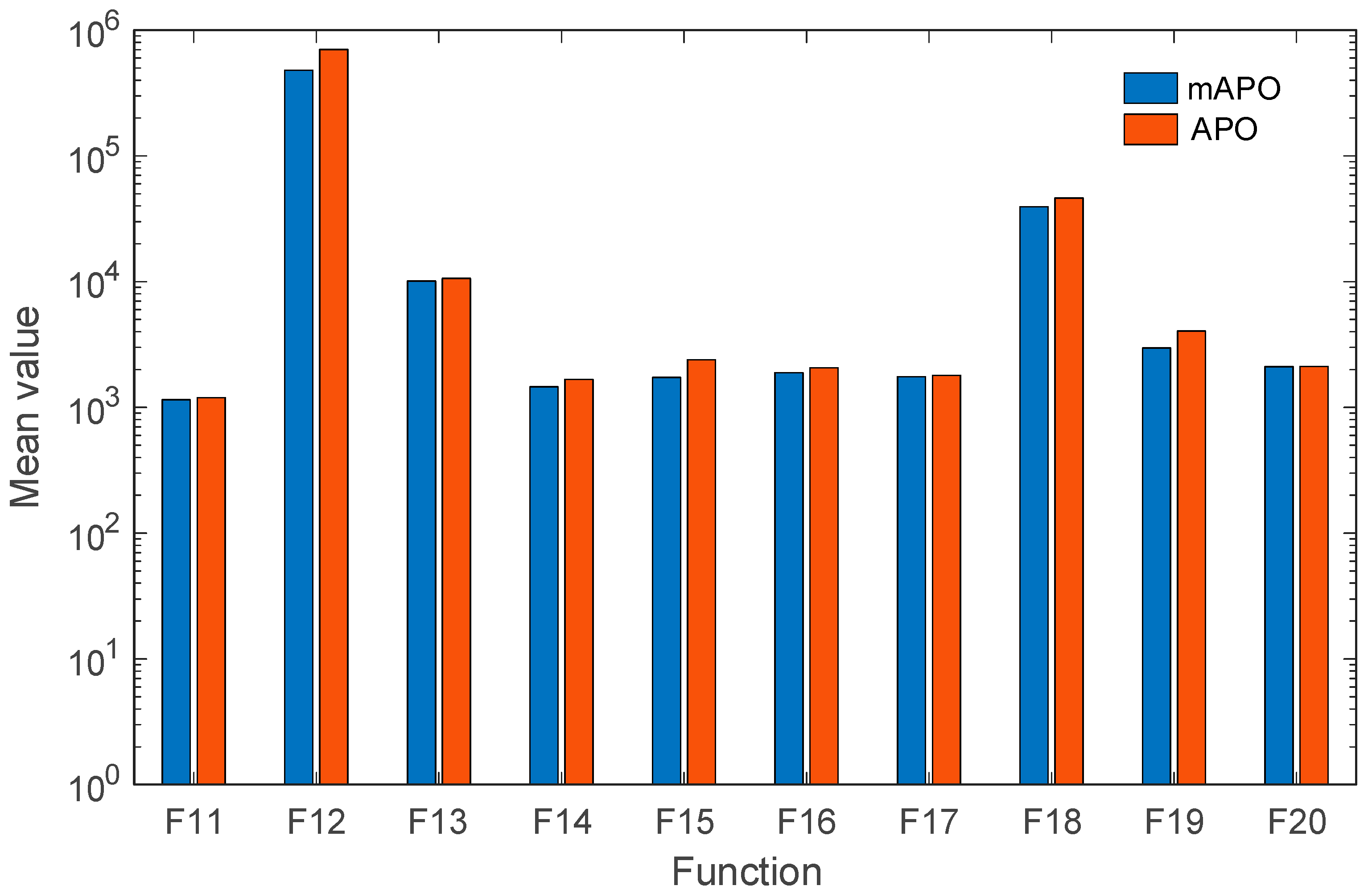 Table 1, indicate that mAPO consistently attains lower mean objective values than APO across almost all test cases. In addition, reduced standard deviation values are observed for mAPO on several functions, suggesting improved stability and repeatability. Notably, for functions such as