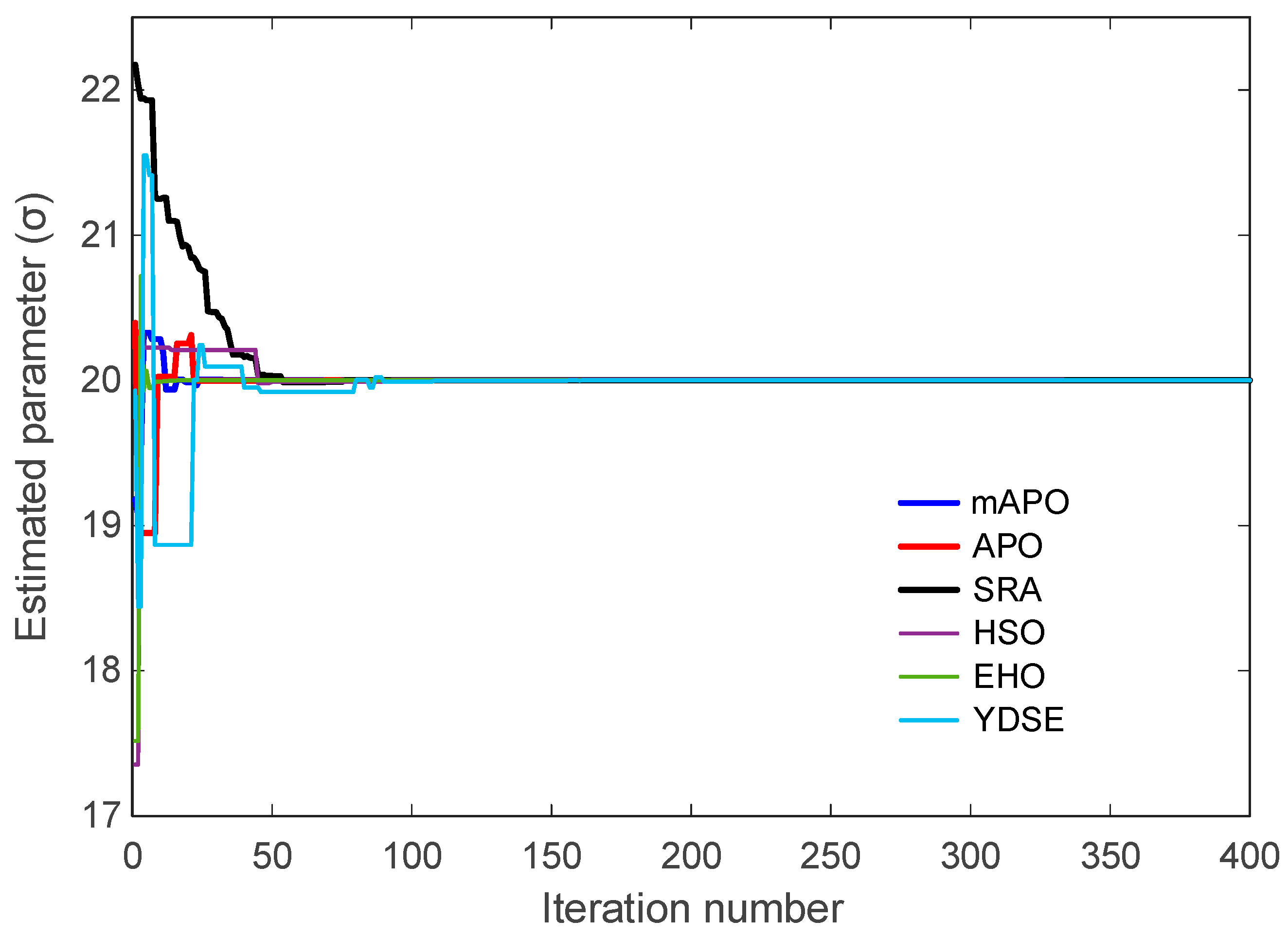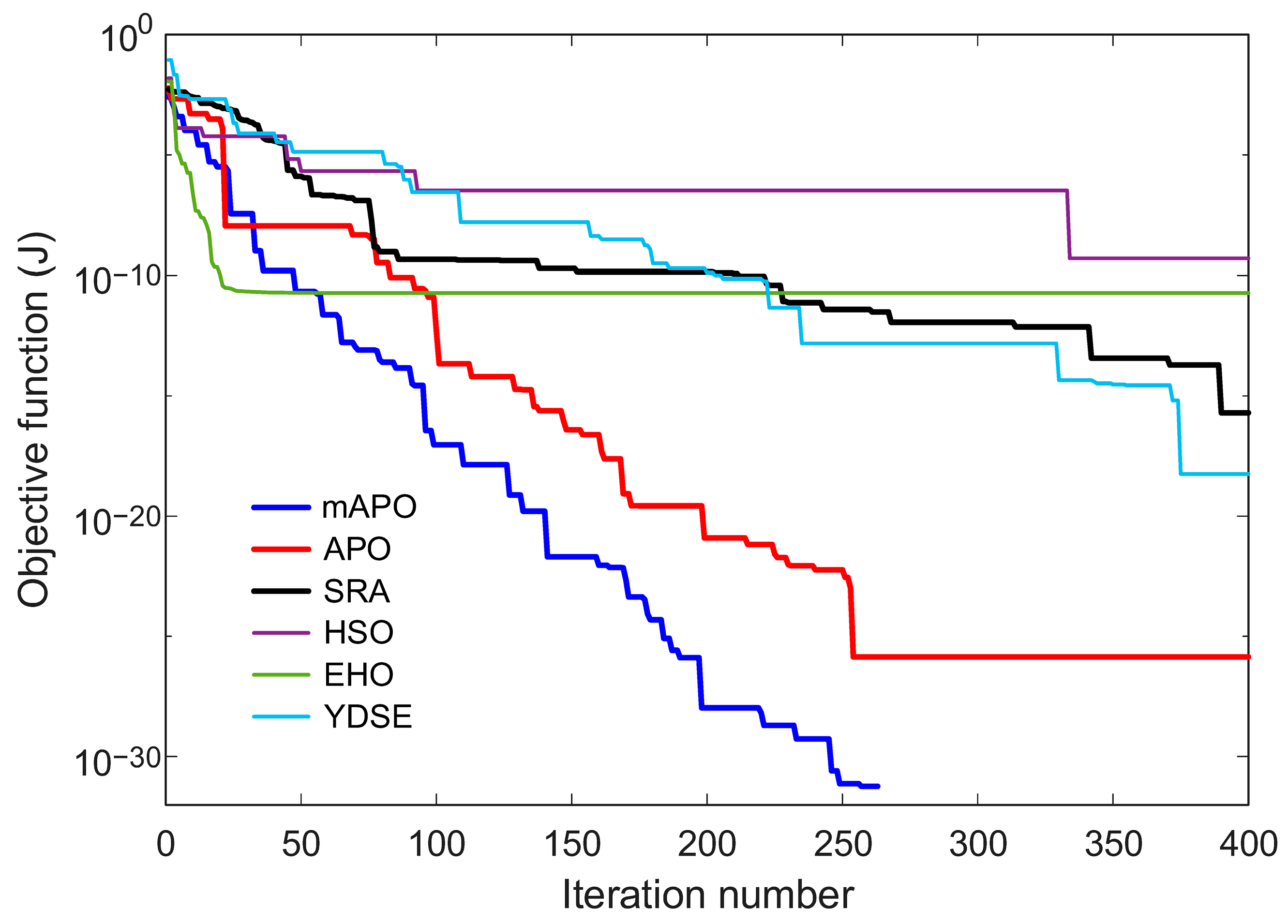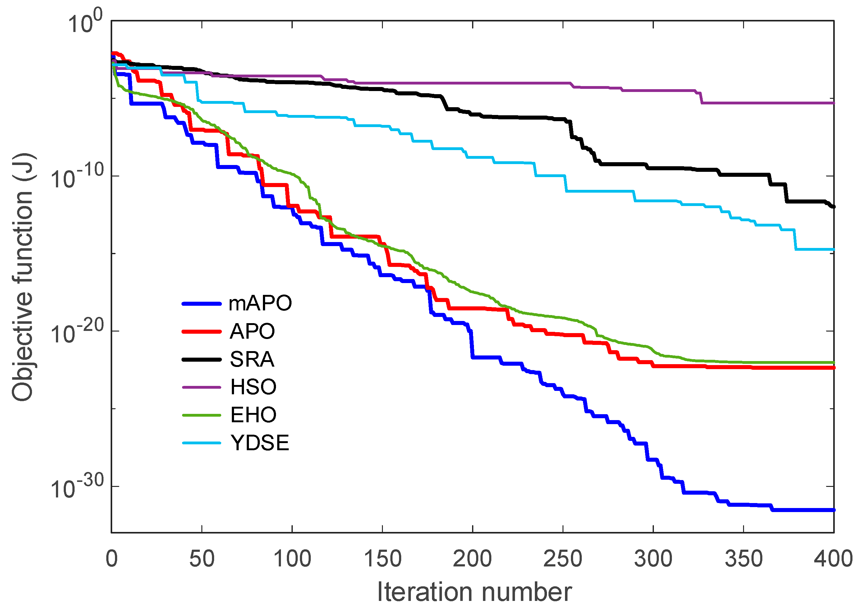 Table 9. While APO produces very small but nonzero errors, SRA, HSO, EHO, and YDSE exhibit noticeably larger objective values and higher variability. The convergence curves in
