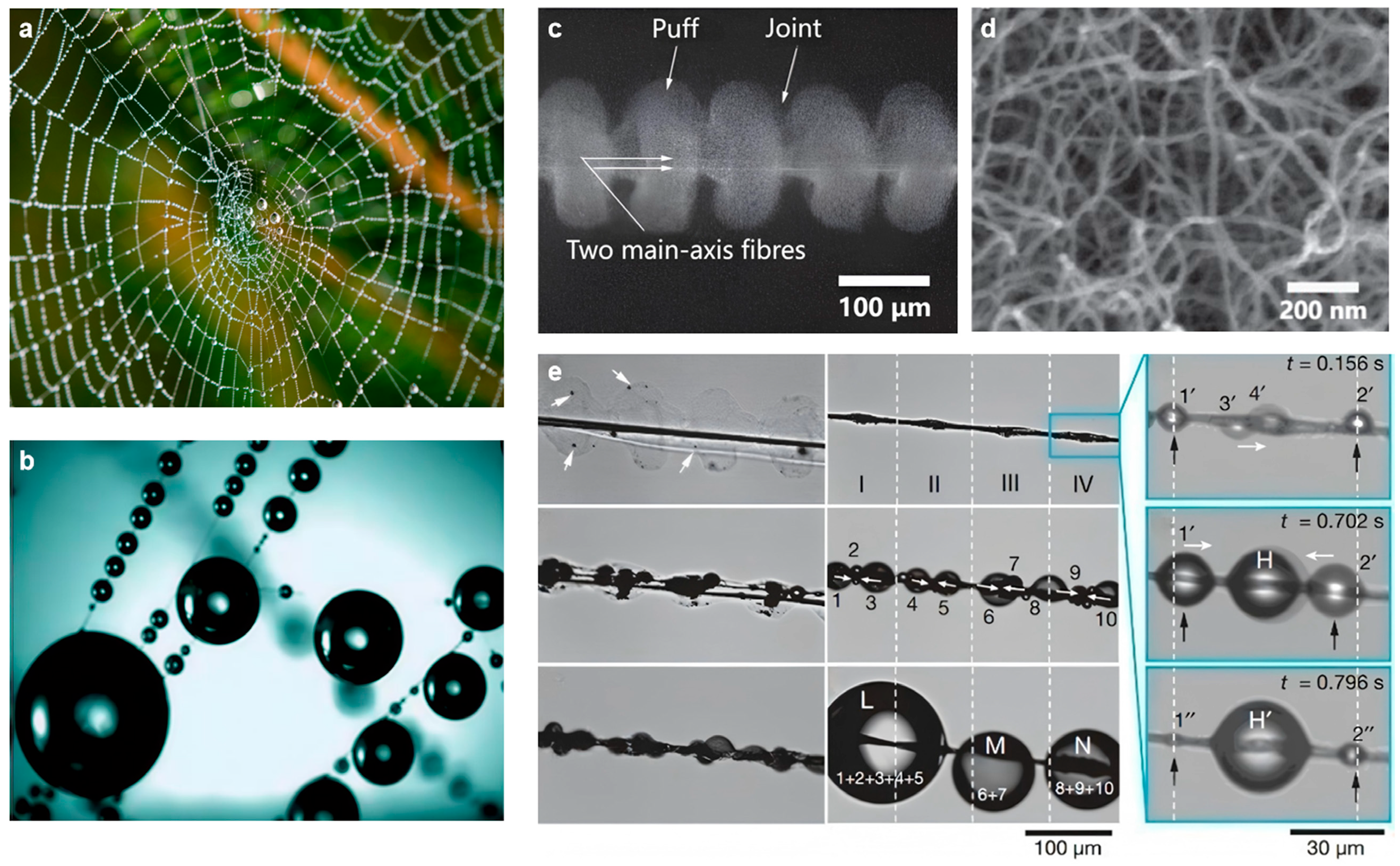 - Chen, W.; Guo, Z. Hierarchical fibers for water collection inspired by spider silk. Nanoscale 2019, 11, 15448–15463. [Google Scholar] [CrossRef]
