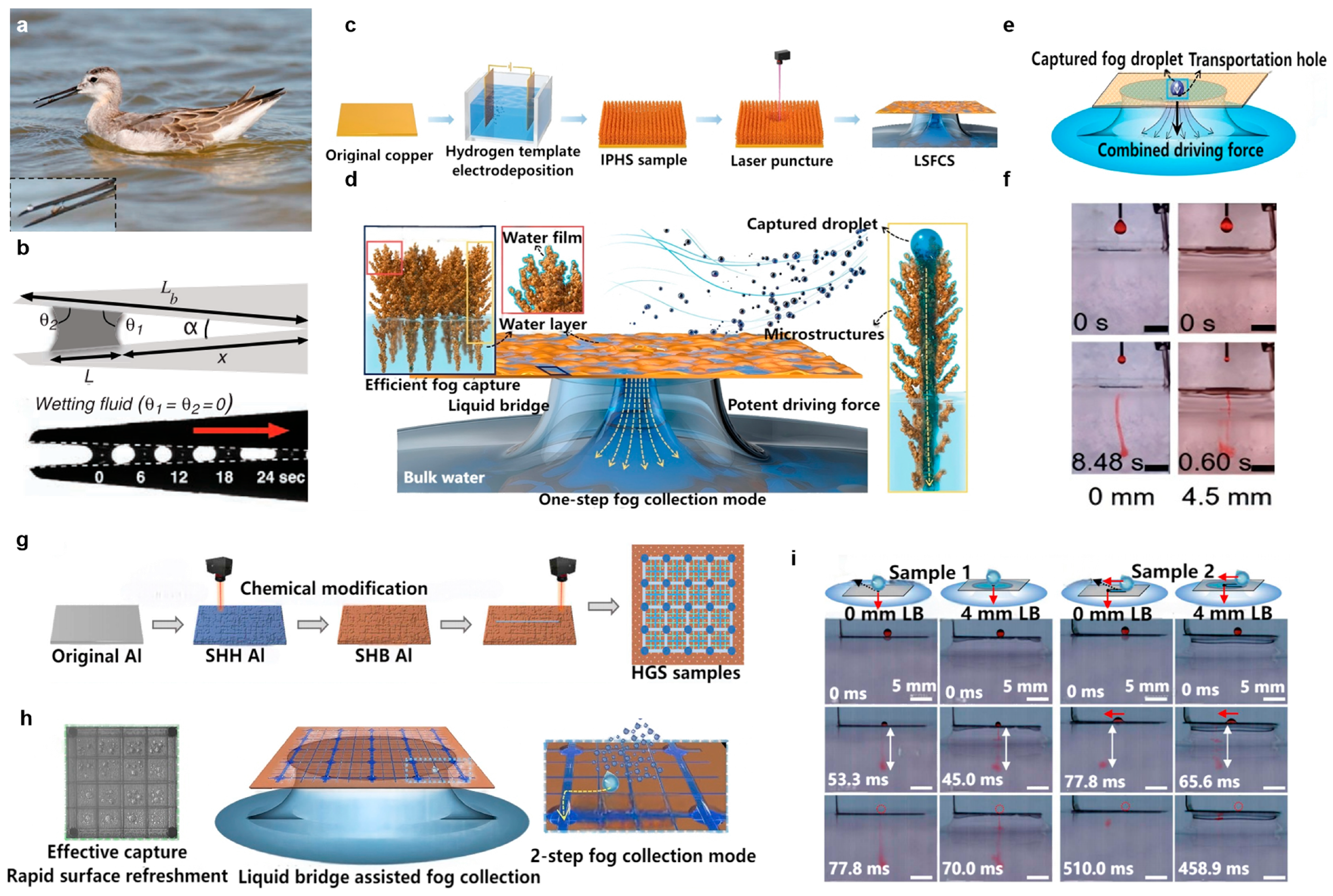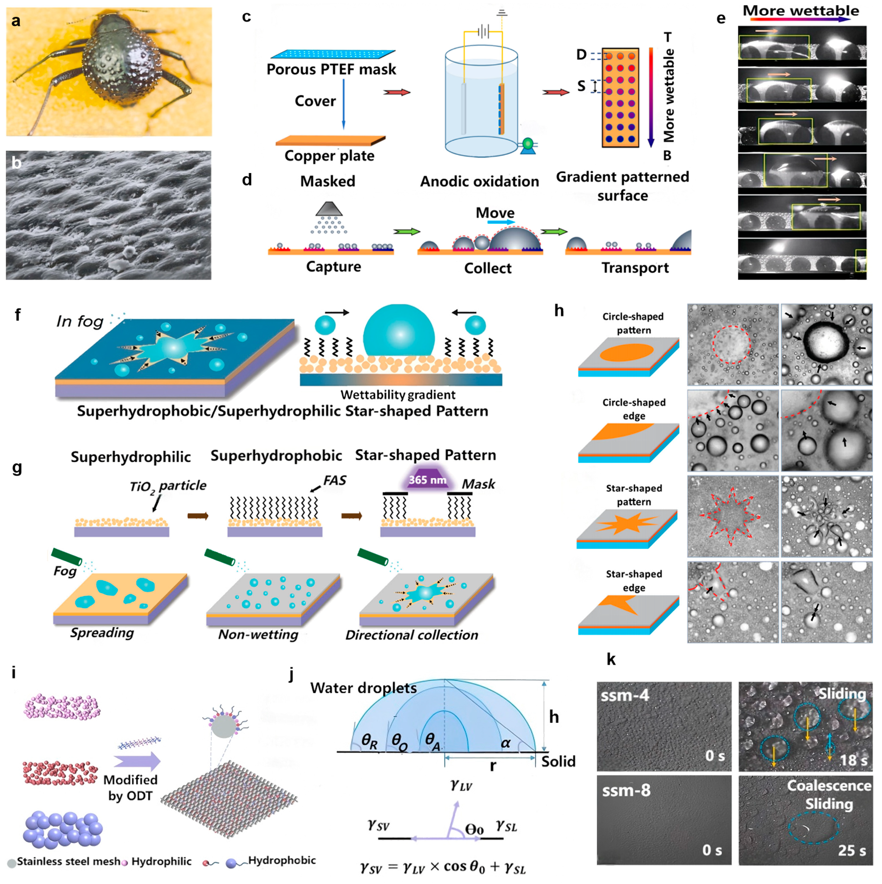 - Zheng, Y.; Yan, Y.; Du, Y.; Yang, F.; Guo, Z. Biomimetic Surface Inspired by Multiple Natural Prototypes for Efficient Fog Water Collection. Langmuir 2025, 41, 21032–21042. [Google Scholar] [CrossRef]