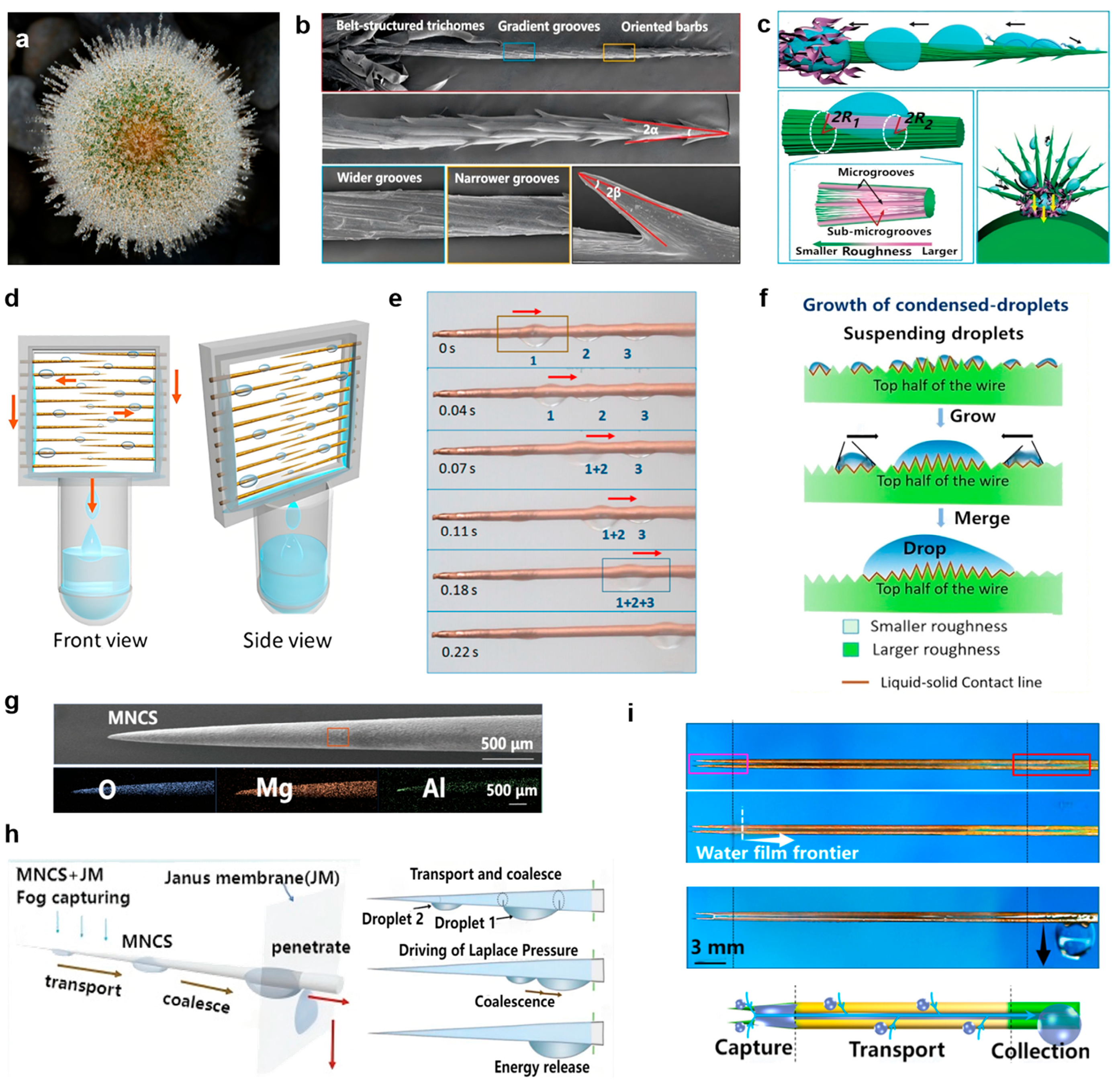 - Zhou, H.; Zhang, M.; Li, C.; Gao, C.; Zheng, Y. Excellent fog-droplets collector via integrative janus membrane and conical spine with micro/nanostructures. Small 2018, 14, 1801335. [Google Scholar] [CrossRef]