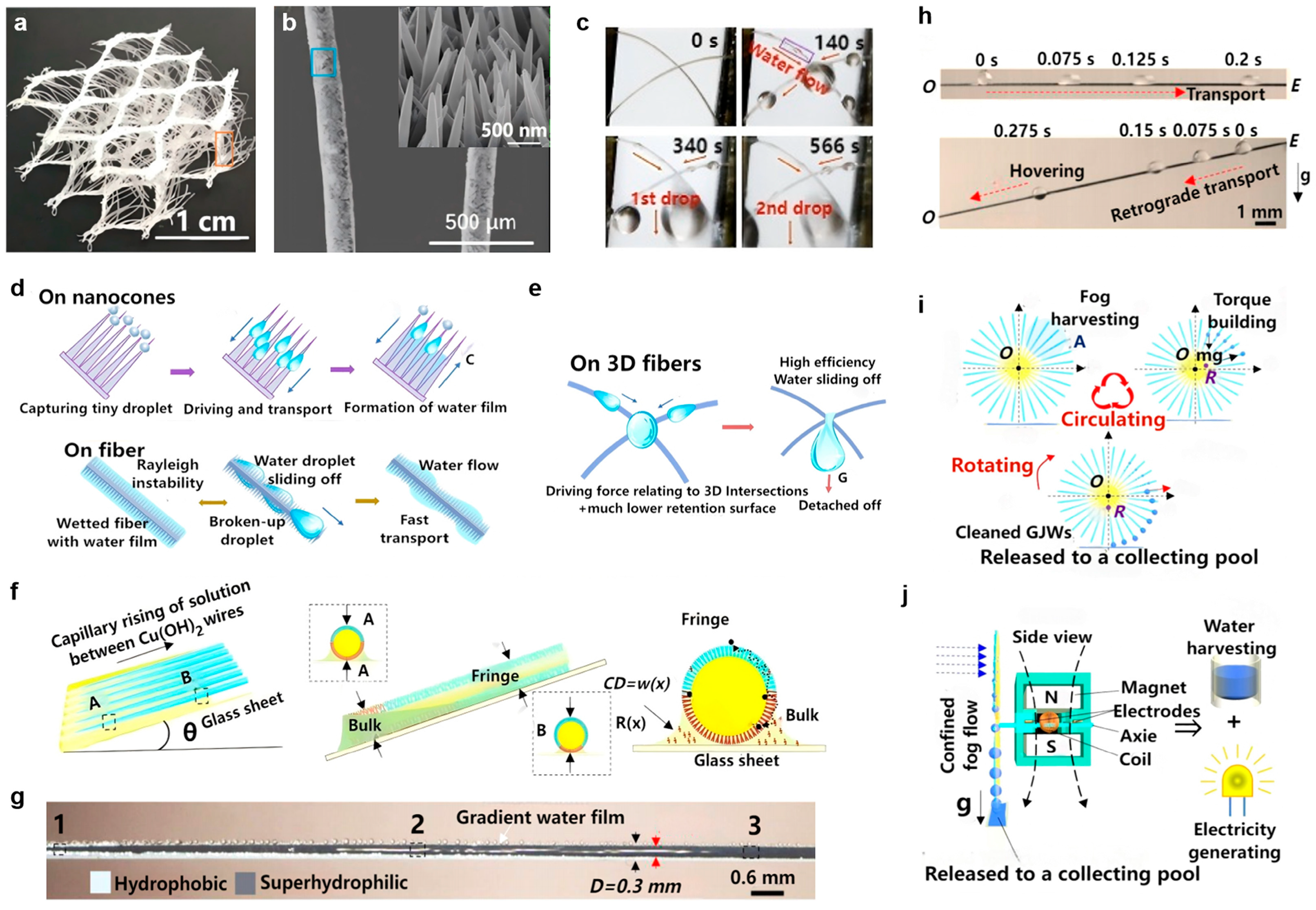 - Li, C.; Liu, Y.; Gao, C.; Li, X.; Xing, Y.; Zheng, Y. Fog harvesting of a bioinspired nanocone-decorated 3D fiber network. ACS Appl. Mater. Interfaces 2019, 11, 4507–4513. [Google Scholar] [CrossRef]
