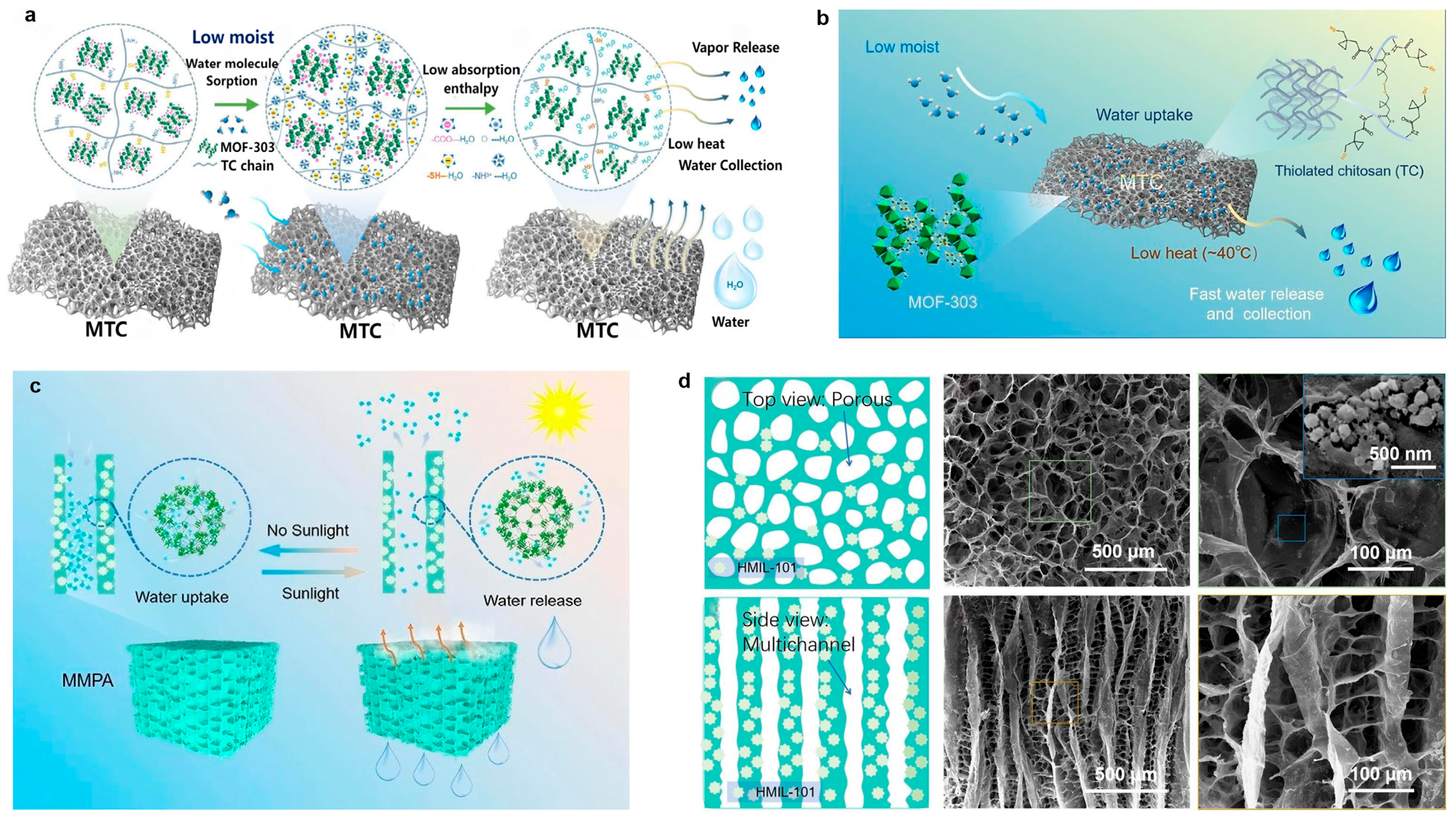 | MTC | — | Moisture absorbency 0.135 g g−1 (12.5% RH)\Water release capacity 0.36 g g−1 (40 °C) | [97] |