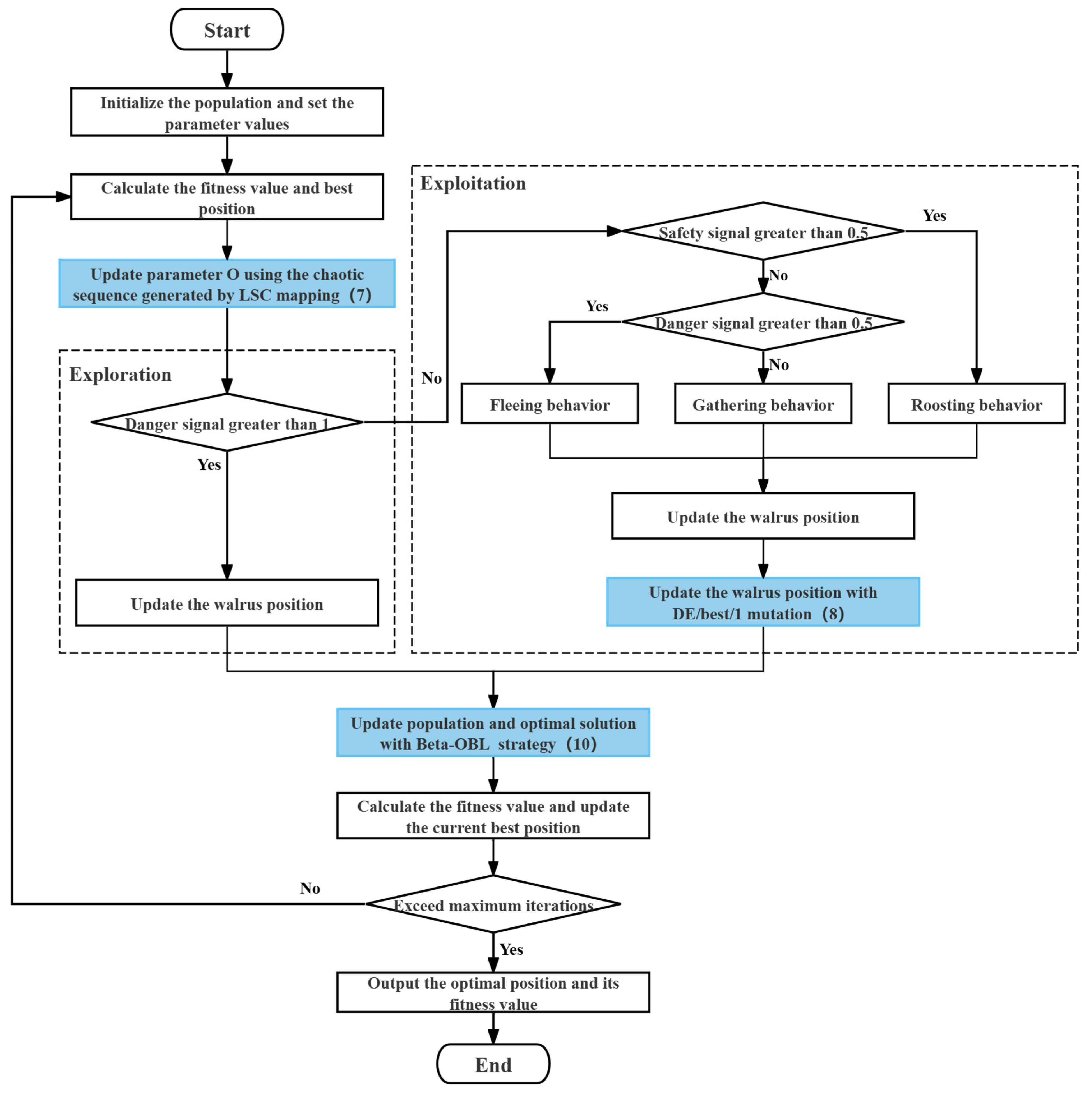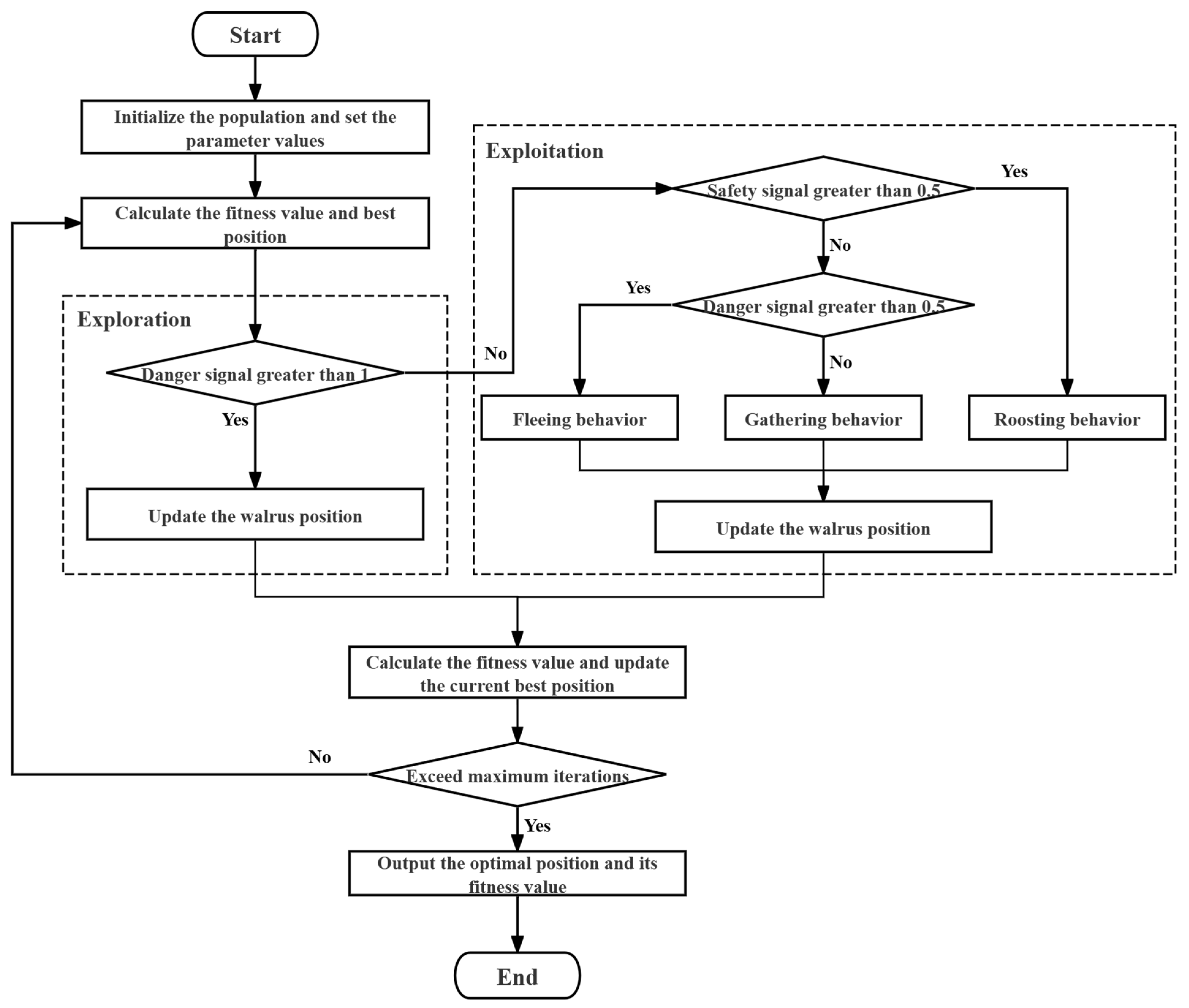 19], inspired by the natural behaviors of walrus populations, proposed the WO algorithm. Specifically, upon receiving key signals such as danger and safety signals, walruses make behavioral choices such as migration, reproduction, habitat selection, foraging, aggregation, and escape. The WO algorithm draws ideas from these behaviors. In the mathematical model of this algorithm, the search space refers to the range within which the algorithm explores for optimal solutions, typically represented as a multi-dimensional space defined by the decision variables of the problem. The solution space encompasses all potential solutions, with each solution analogous to the position of a walrus in the search space, representing a potential solution to the problem. It can be a vector, where each component corresponds to the value of a decision variable, although the decision variables are determined by the specific problem. The core task of the WO algorithm is to find the optimal solution in the search space that minimizes or maximizes the objective function of the optimization problem.