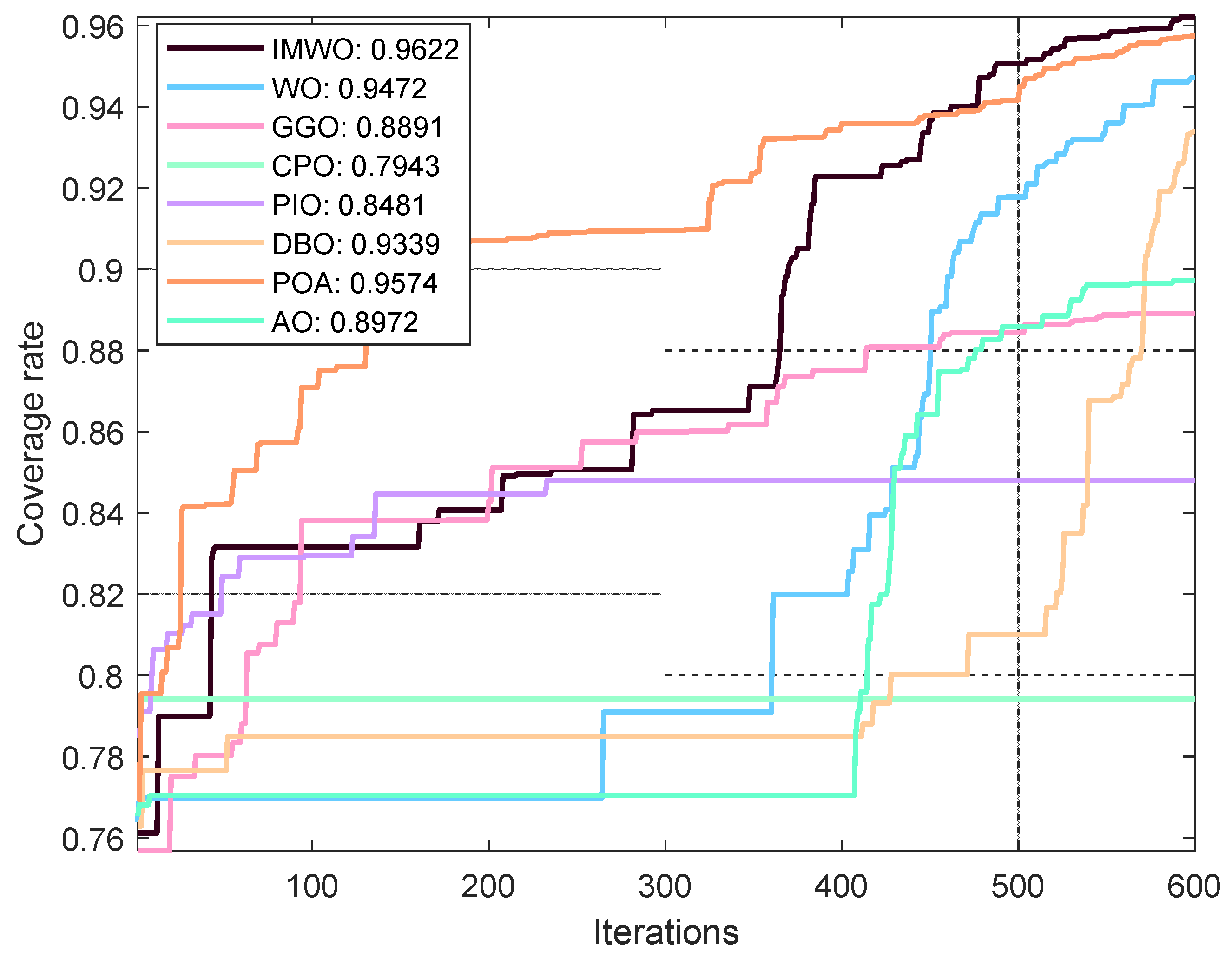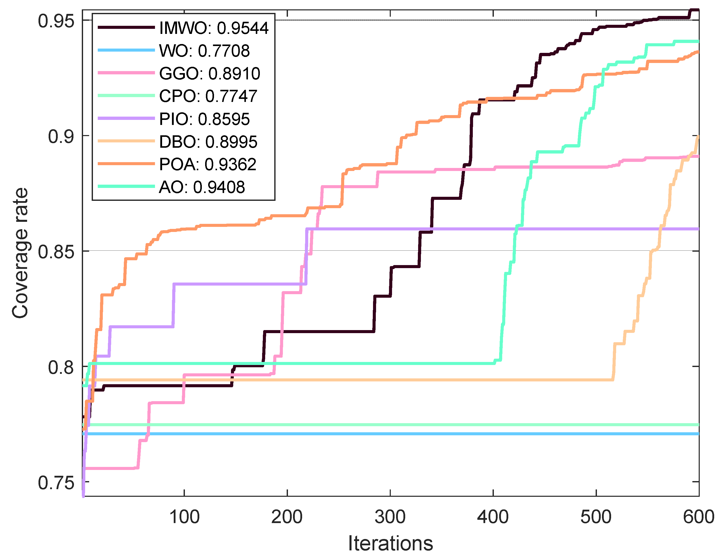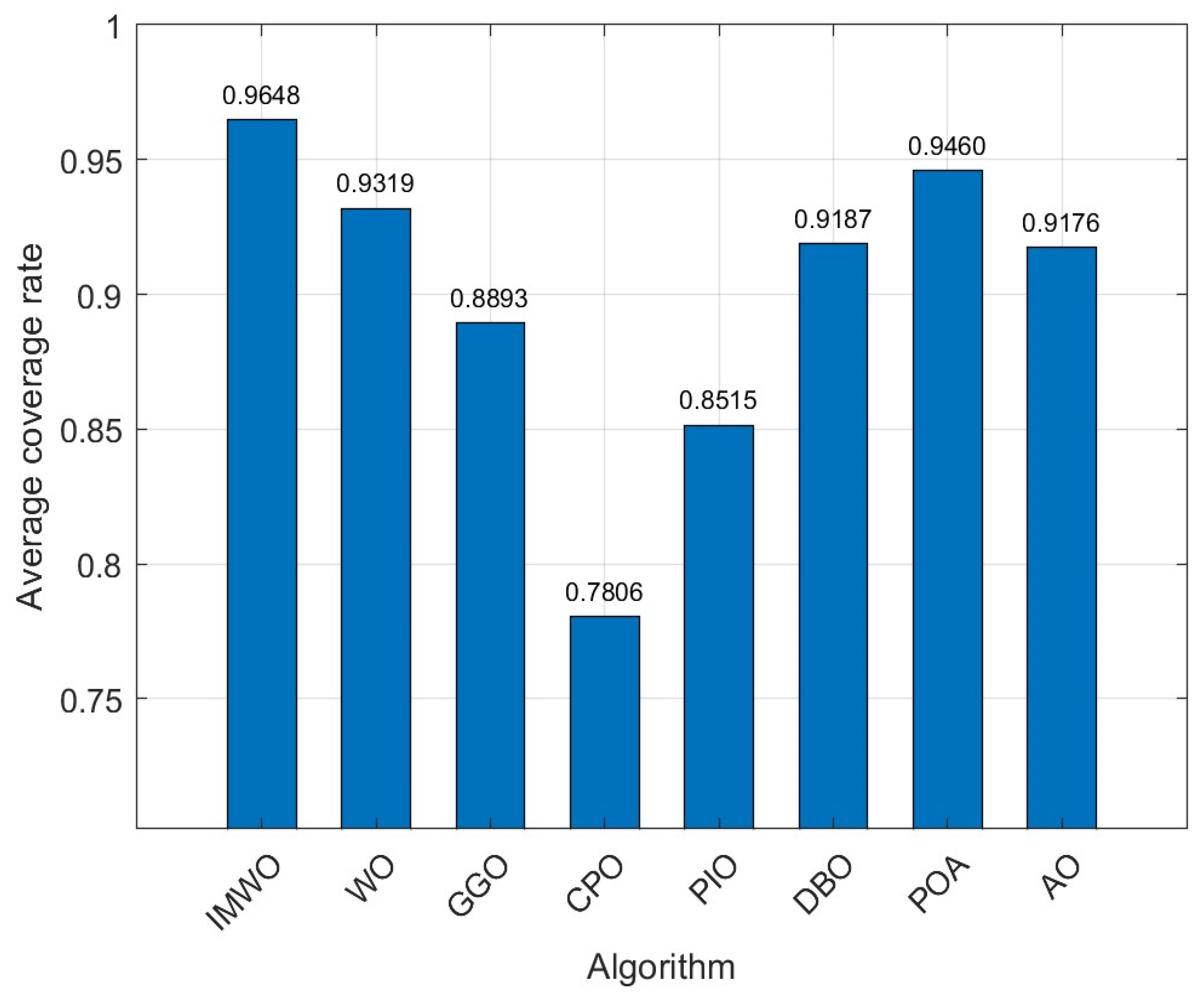 Figure 11 that IMWO’s average value of 0.9586 is the highest among all algorithms, exceeding WO’s 0.9186. The maximum value of 0.9688 is also the best, higher than the 0.9605 of POA and 0.9439 of AO. The minimum value of 0.9454 is also the highest, and far higher than the 0.7635 of WO. IMWO has obvious advantages over WO, with its average performance being 4.0 percentage points higher and maximum coverage rate 0.88 percentage points higher, while the minimum value leads by 18.19 percentage points. This indicates that IMWO not only performs better overall, but also shows a significant improvement in stability.