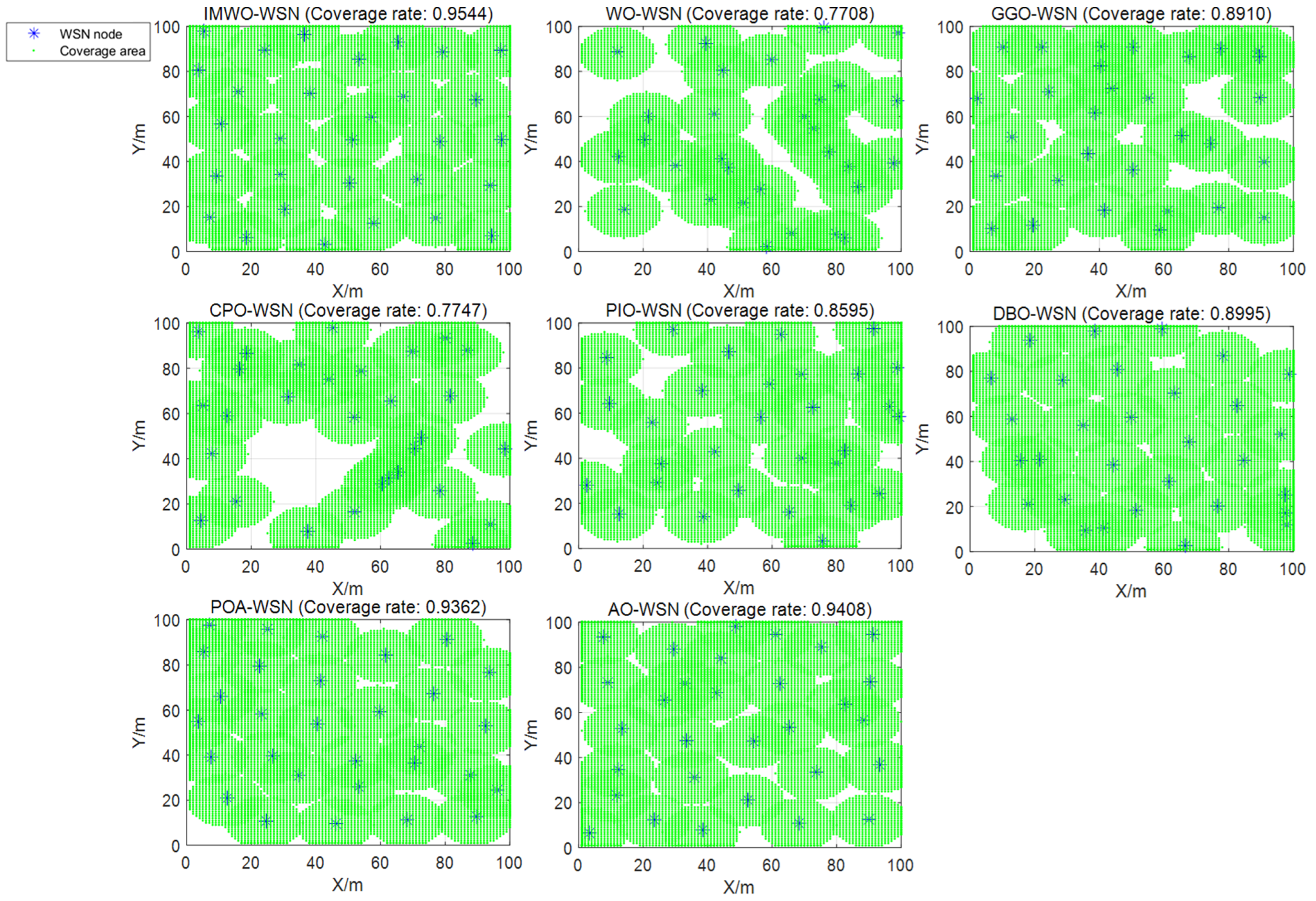Figure 10, the node distribution of IMWO in a single run is more uniform and it achieves the highest coverage rate, surpassing the original algorithm WO and the other six comparison algorithms. The average coverage results of the eight algorithms after 30 operations are shown in