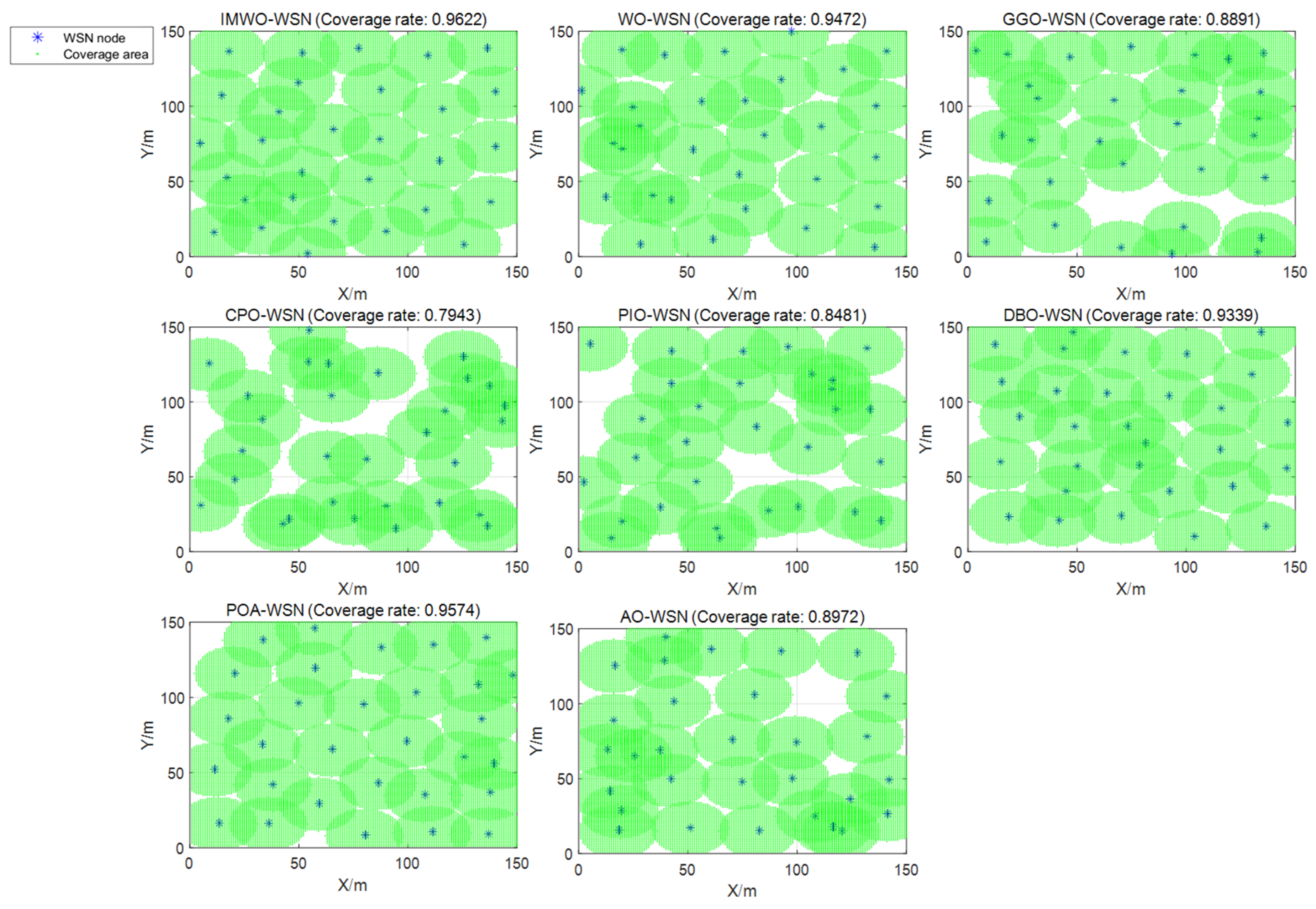 Figure 13, the node distribution of IMWO in a single run is more uniform, and it achieves the highest coverage rate, surpassing the original algorithm WO and the other six comparison algorithms. The average coverage results of the eight algorithms after 30 runs are shown in