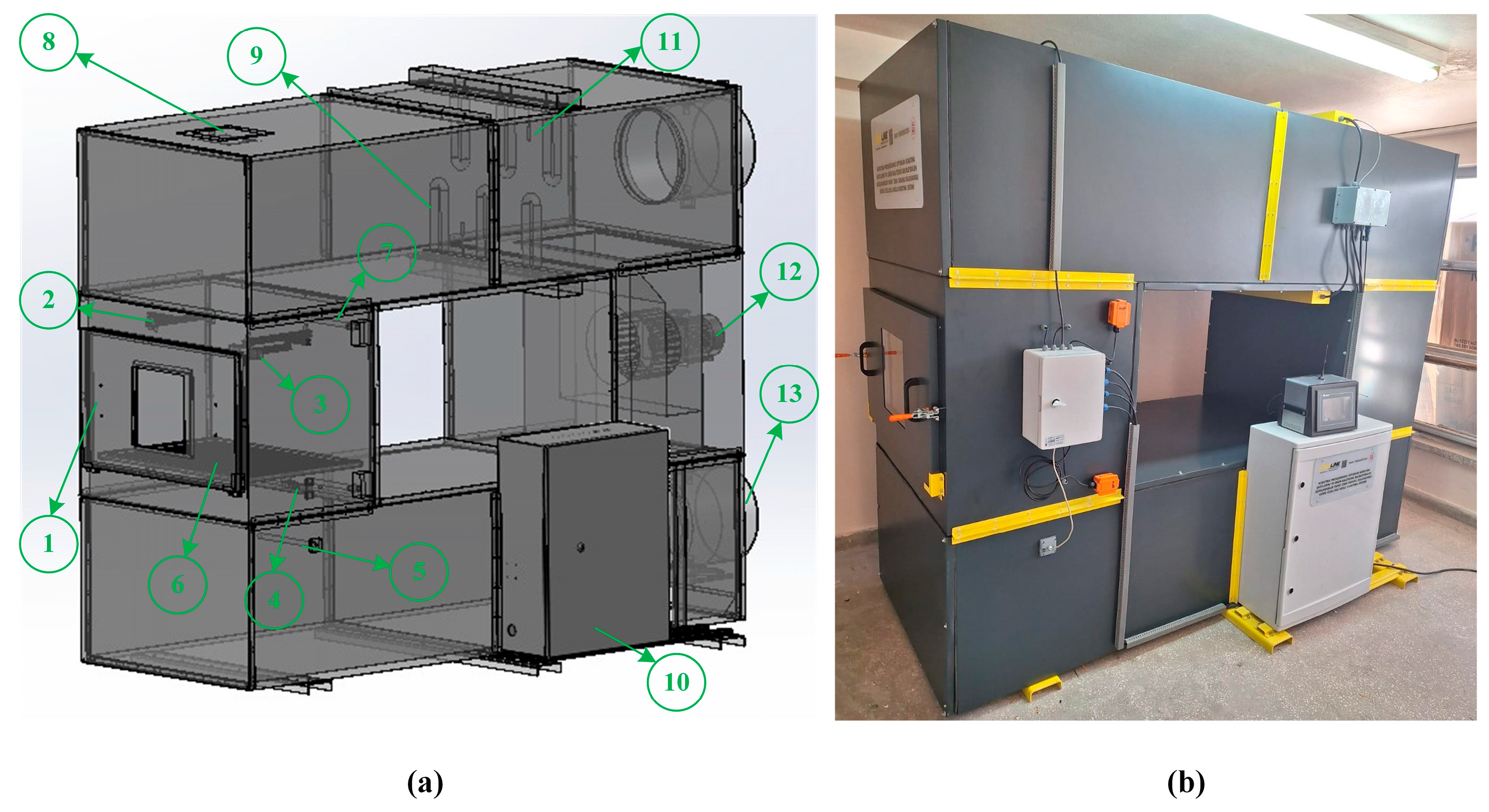 Figure 1a shows the three-dimensional design of the system designed for the experiments conducted and the numbering of its components, while