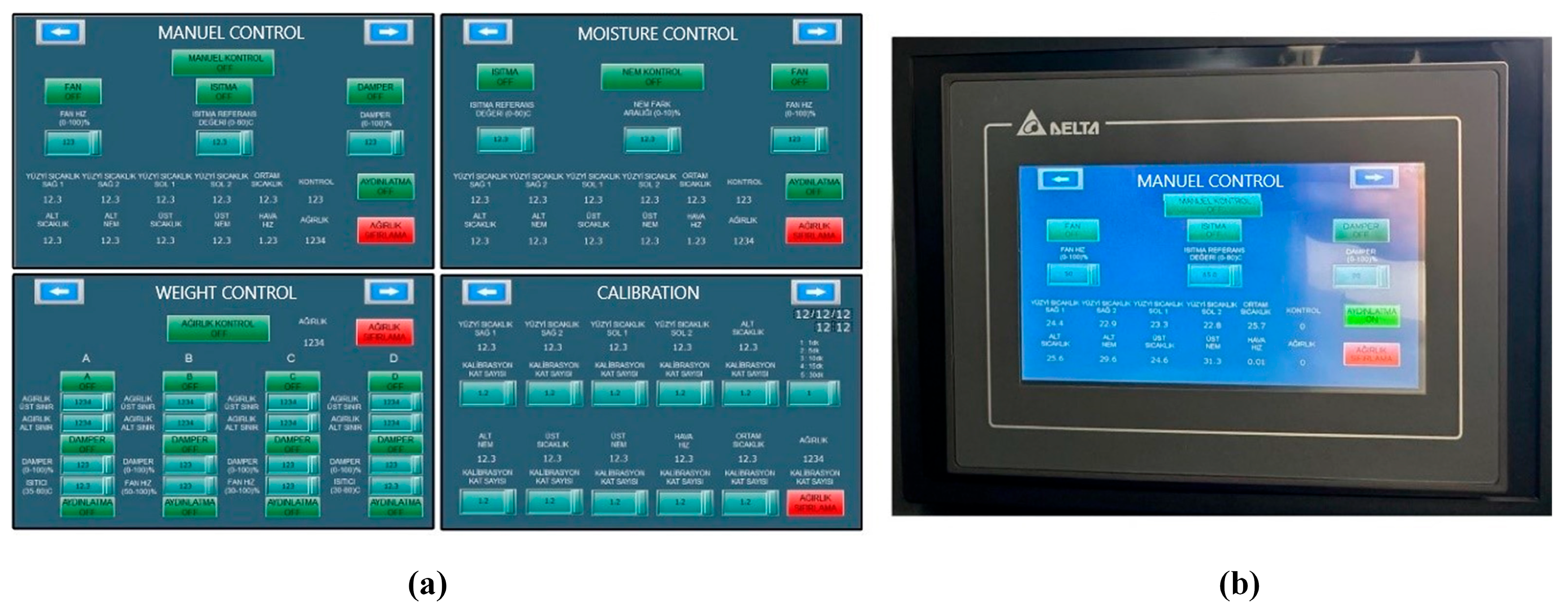 When food samples are tested by drying, interface pages are created on the PLC’s HMI panel to enable the necessary calibrations and controls to be performed so that parameters such as temperature, humidity, weight, and air velocity can be successfully measured. This was implemented on the system as shown in