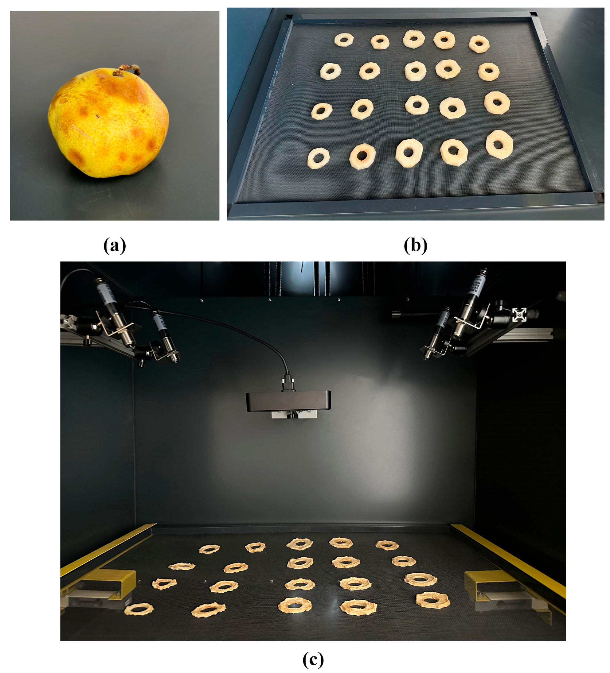 8] used a convective dryer equipped with a computer vision system and a load cell to continuously monitor unbleached or bleached carrot slices during the drying process. The setup of these systems enabled them to use the linear regression method to track product characteristics (weight, color, and size) and develop moisture prediction models related to shrinkage. The linear models based on the shrinkage examined yielded better results compared to more complex, specific thin-layer models.