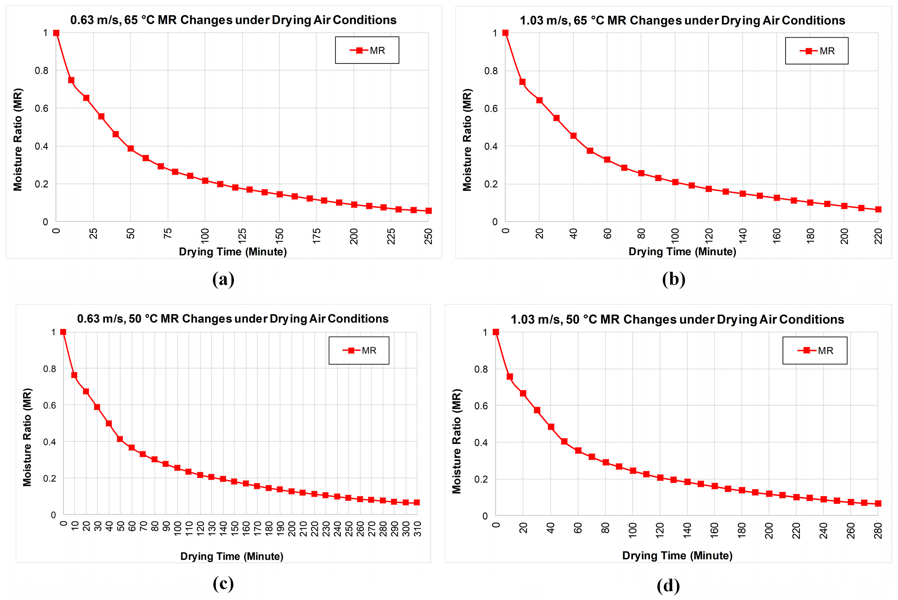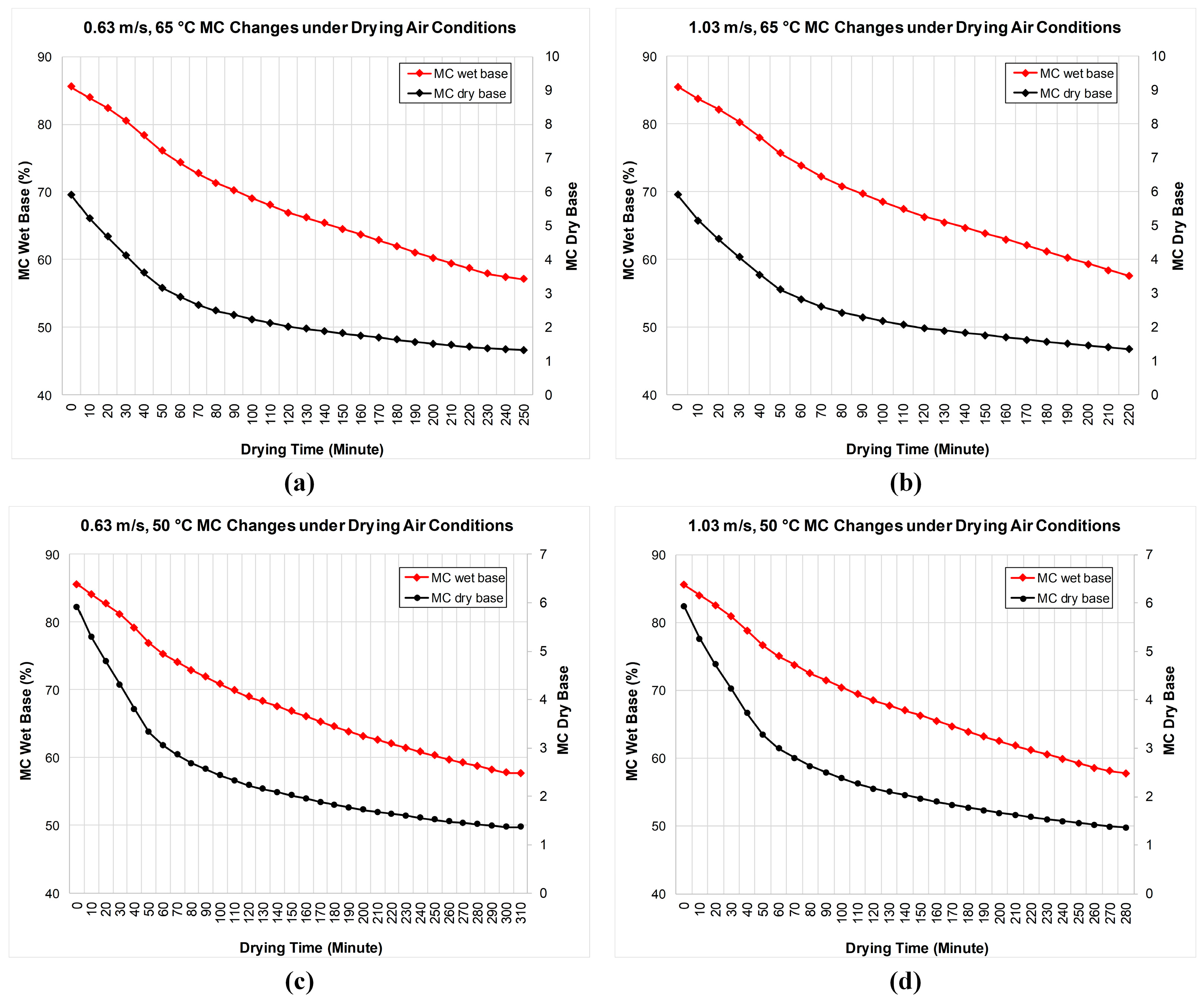 Mass transfer calculations for the product were performed in drying experiments. In the experiments, the product’s wet- and dry-basis moisture content, moisture ratio values, and drying efficiency values are calculated. The moisture content of food products is evaluated as the amount of water they contain. Percentage parameters are used to express the amount of water in food. Wet- and dry-basis definitions are used to determine moisture content. Equations (1) and (2) are used to calculate the moisture content (