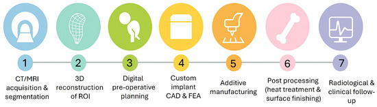 CT datasets into architected lattice implants, as well as how these constructs are fabricated and numerically, mechanically, biologically, and clinically verified. We outline imaging pipelines, including Digital Imaging and Communications in Medicine (DICOM) acquisition, segmentation, contralateral mirroring, and Hounsfield Units (HU)–density–elasticity mapping, and show how these choices impact finite element (FE) models and print-ready geometries. Next, lattice design strategies and mixed-material concepts are compared and linked to specific additive manufacturing routes in metals, polymers, and bioceramics, such as laser powder bed fusion (LPBF), electron beam melting (EBM), fused deposition modeling (FDM), material jetting, and extrusion-based bioprinting. Methodological overviews of linear–elastic models and homogenized finite element (FE) models, along with bench-top mechanical tests, in vitro cell assays, in vivo animal studies, and early clinical series, are utilized to categorize the studies into four pathways: simulation (S), mechanical (E_mech), biological (E_bio), and validation (V). Based on the reviewed literature, we establish a general workflow for CT implants. We identify common gaps in the process, observe insufficient reporting of imaging and modeling details, note a lack of data on fatigue and remodeling, and recognize the limited size of clinical cohorts. Additionally, we provide practical recommendations for developing more standardized and scalable planning pipelines. Part 1 of this two-part review studied defect patterns, anatomical location, and fixation strategies for patient-specific lattice implants used in femoral and tibial segmental reconstruction, with emphasis on how defect morphology and subregional anatomy influence construct selection and mechanical behavior. It established a defect- and fixation-centered review that provides the clinical and anatomical context for the workflow and validation analysis presented in Part 2.