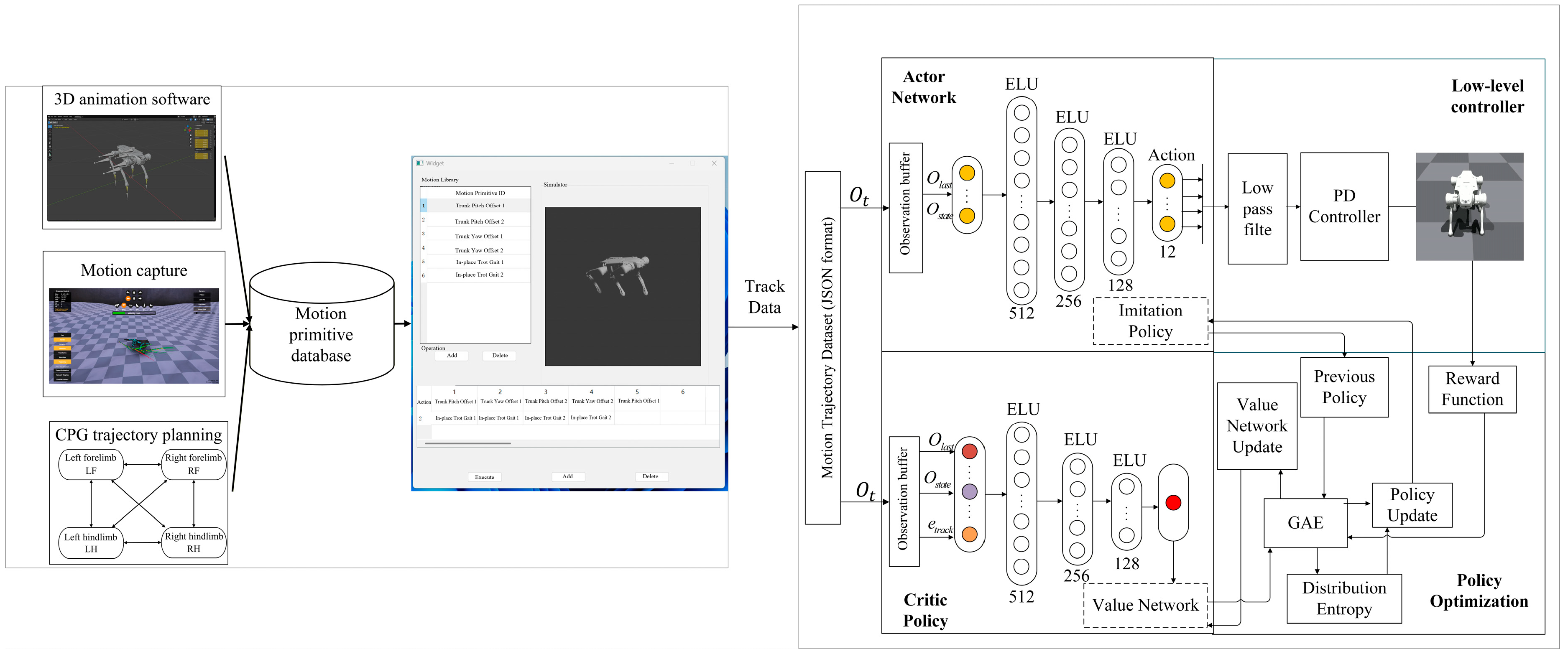 An expert trajectory-guided Actor–Critic multi-objective optimization framework was improved for the motion control of quadruped robots. It incorporates a composite reward function to achieve hierarchical control under multi-task objectives, while integrating motion primitive imitation learning to accelerate policy convergence during training.