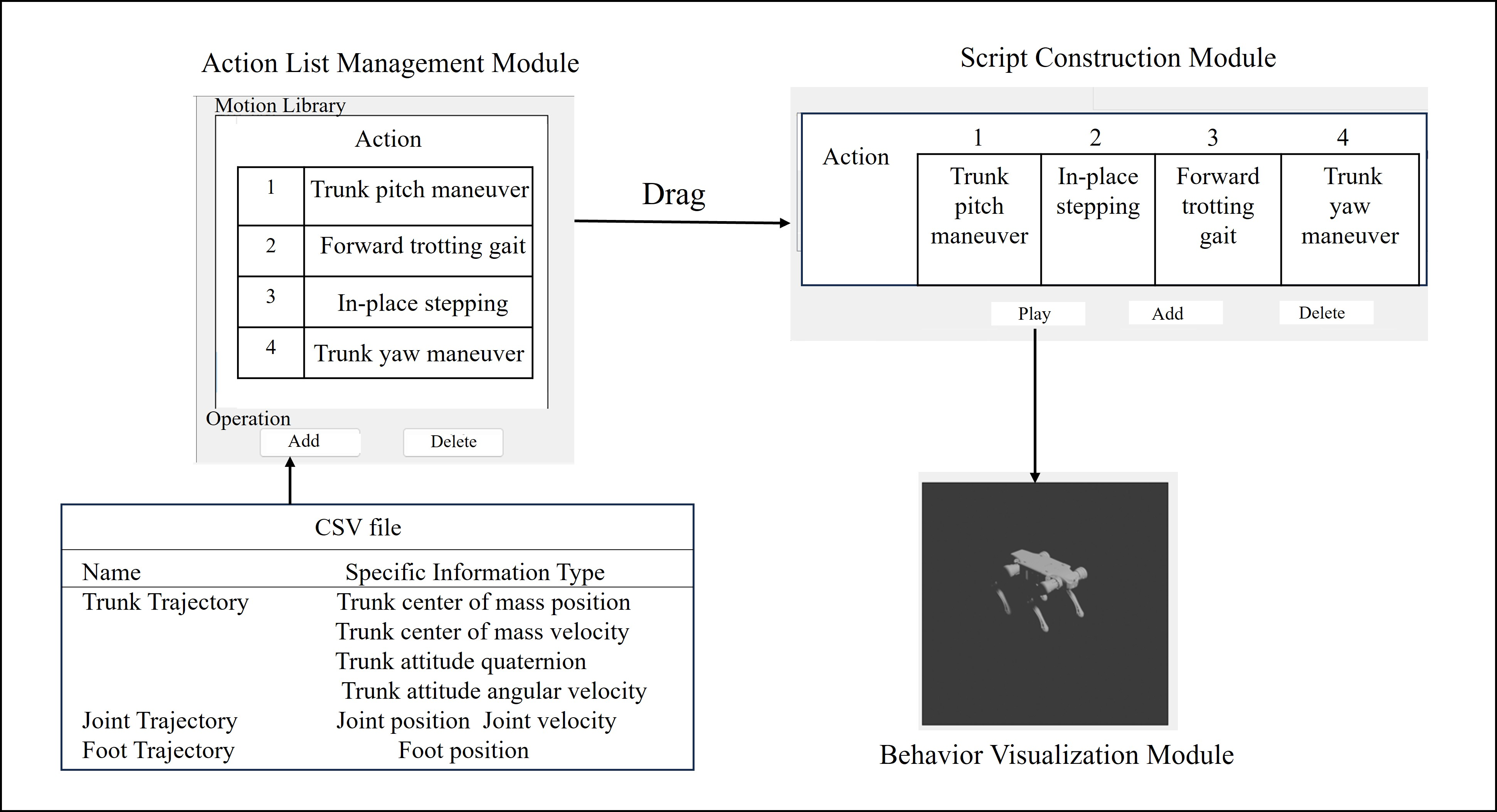 A fundamental motion primitive library for quadruped robots was designed, establishing an underlying behavioral foundation for executing complex tasks and enabling flexible motion control.