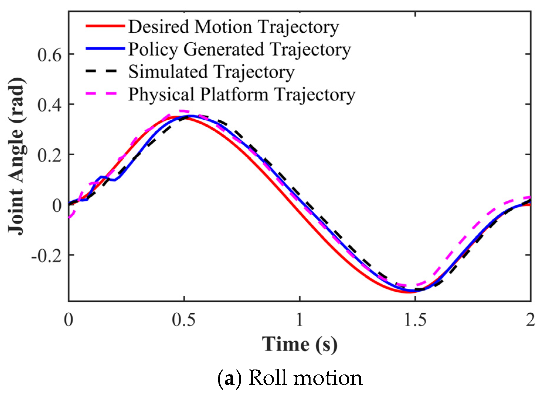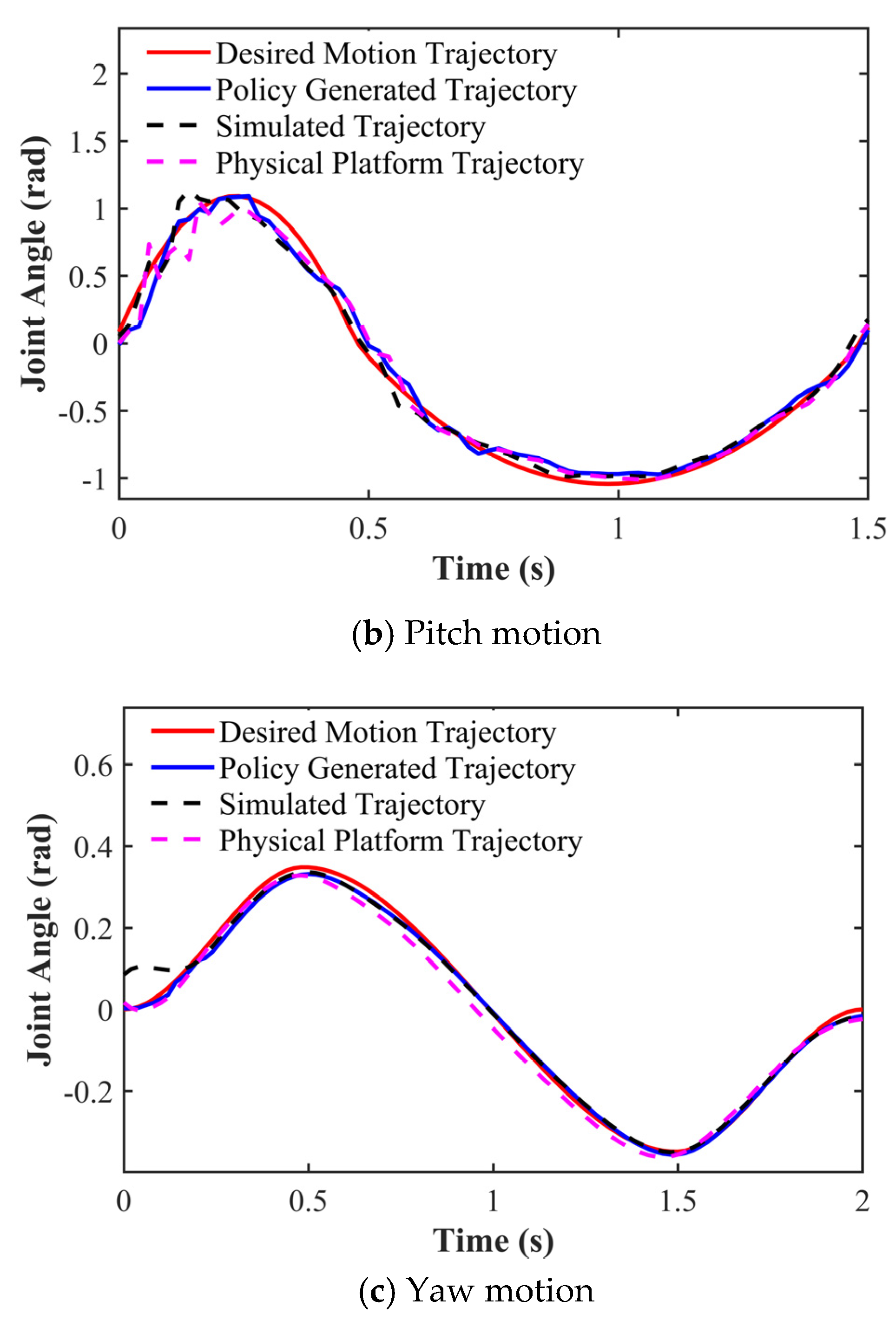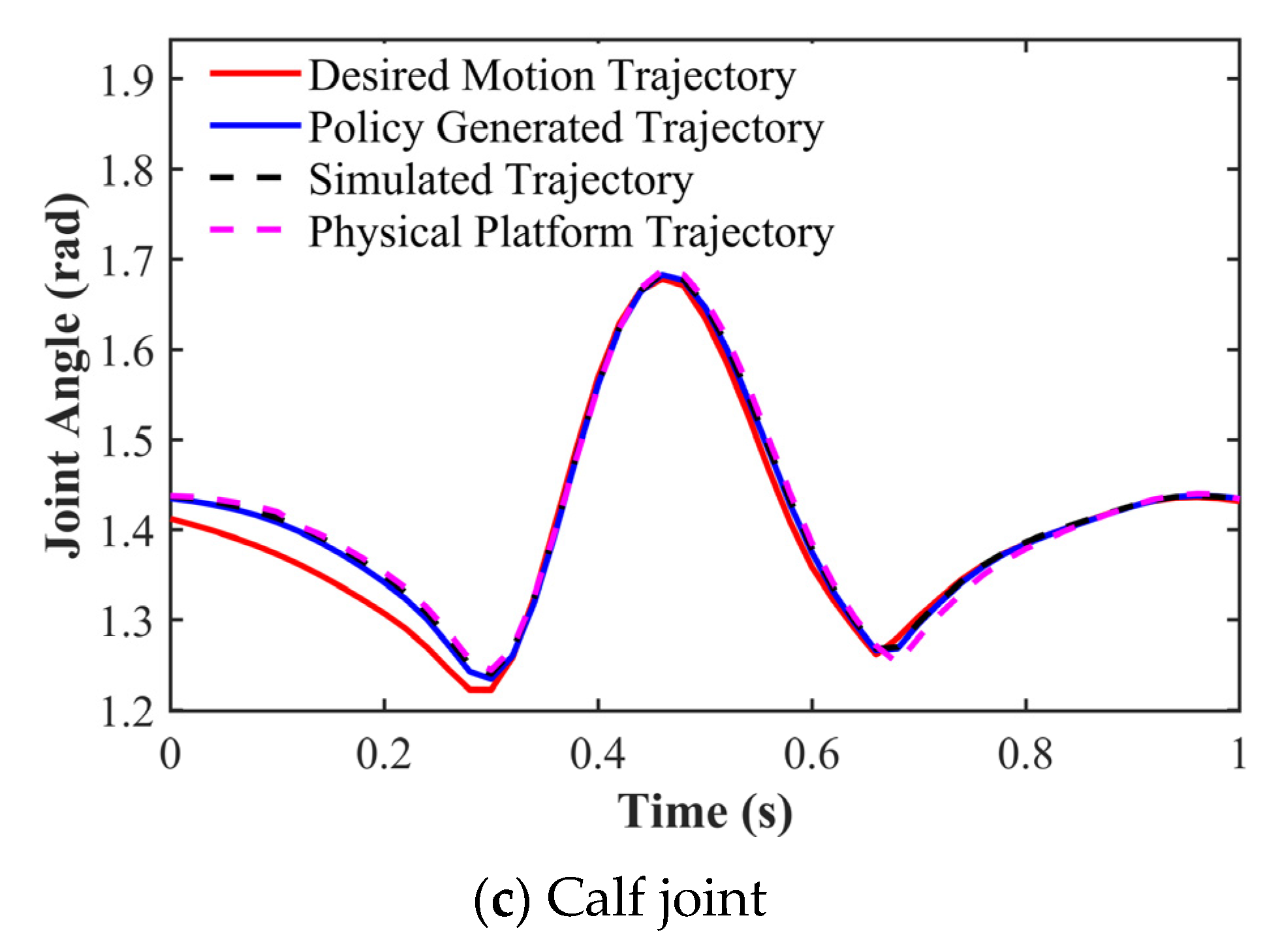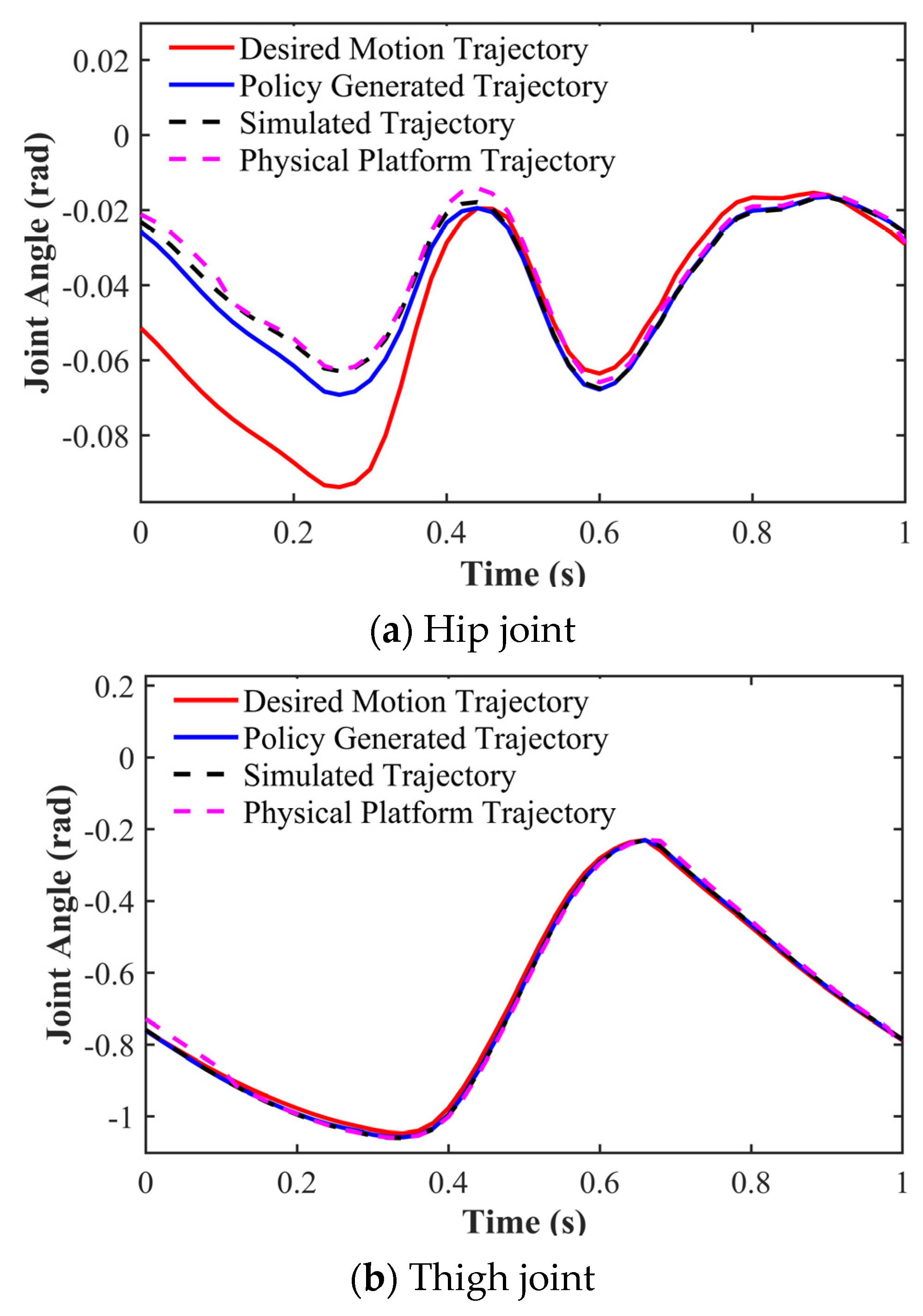 Figure 10, the complete gait cycle analysis demonstrates that trained, simulated, and experimentally measured trajectories all effectively track target joint angles, while exhibiting excellent continuity and smoothness without observable step distortion. Notably, the hip joint’s initial rotation displays an inward flexion tendency due to training-phase configurations designed to ensure motion initiation continuity.