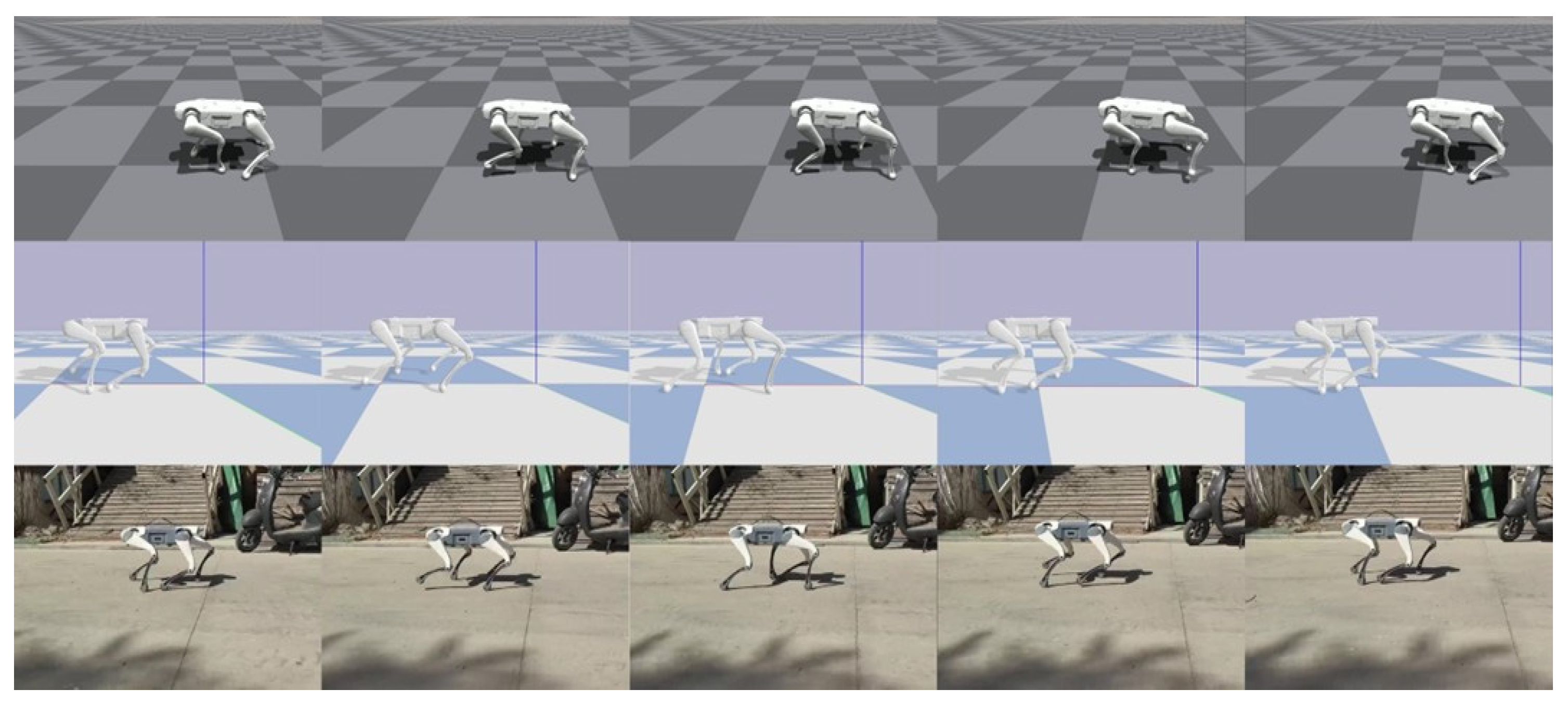 To evaluate sim-to-real transfer performance, the policy trained in simulation was directly deployed on the Lite3 quadruped robot without any additional fine-tuning. During training, limited domain randomization and observation noise were introduced to improve robustness to real-world uncertainties, as described in