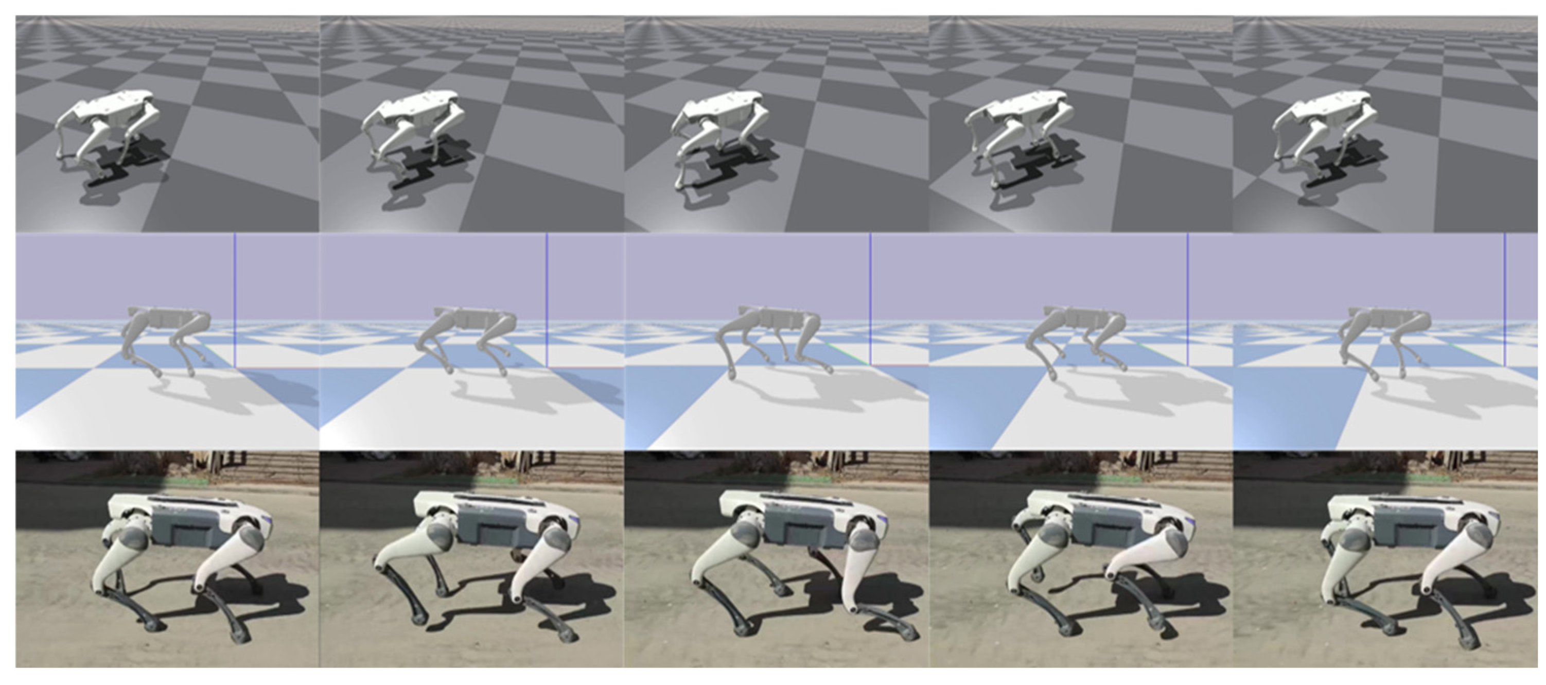 23] designed a ground reaction force (GRF)-based reward function for animal motion imitation, achieving dynamic speed transitions during galloping and validating the efficacy of bio-inspired strategies for dynamic performance optimization. Chen et al. [