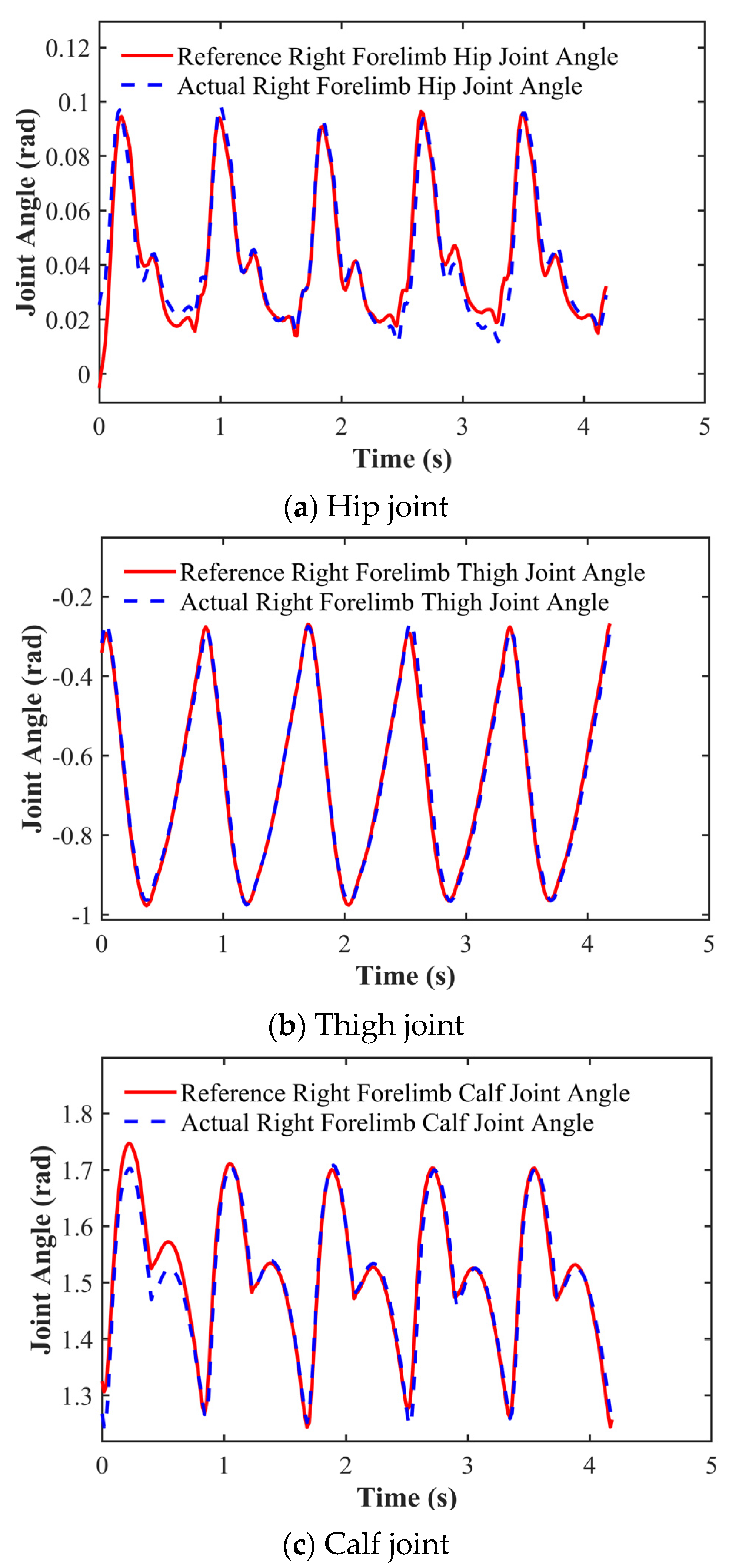 Figure 11 further presents the joint angle tracking performance of the hip, thigh, and calf joints during 5 s periodic motions, with quantitative data confirming the effective reference angle across all three joints.