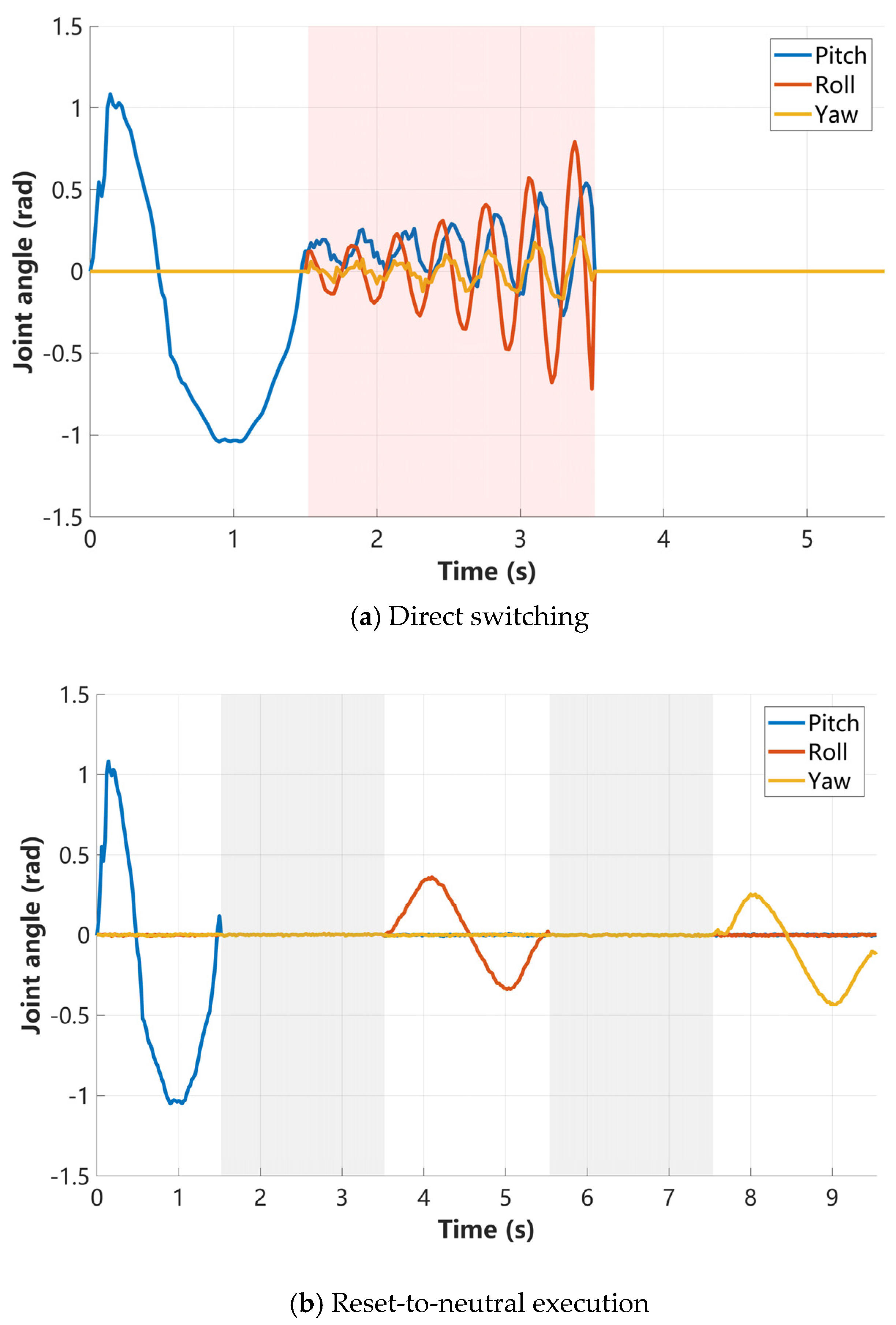 Overall, although both the proposed method and the reset-based baseline were able to complete the task without instability, our approach achieves substantially smoother execution and higher efficiency by eliminating unnecessary waiting phases. In contrast, direct switching consistently fails due to the lack of effective continuity between consecutive motions.