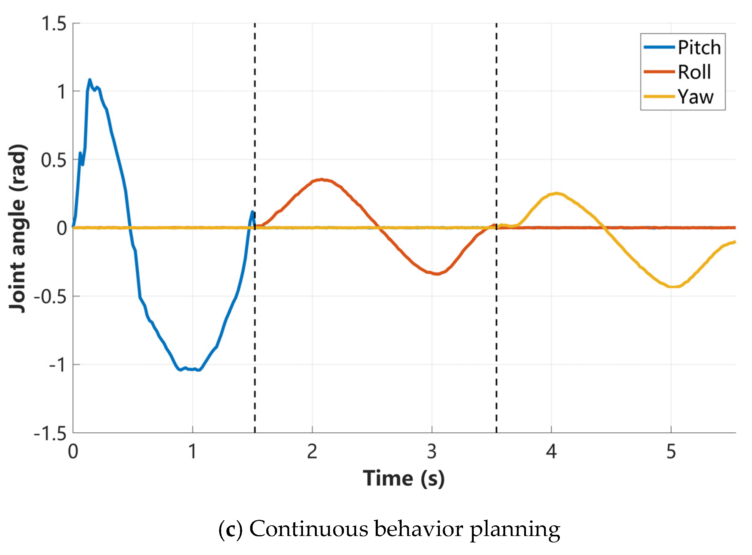 Figure 14c, Method C (ours) maintains continuity between consecutive motions during switching, keeping the attitude changes smooth. The roll, pitch, and yaw angles vary smoothly over time, allowing the motion sequence to be completed continuously.