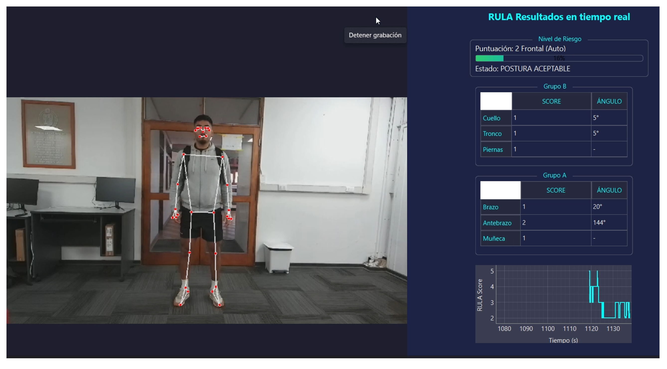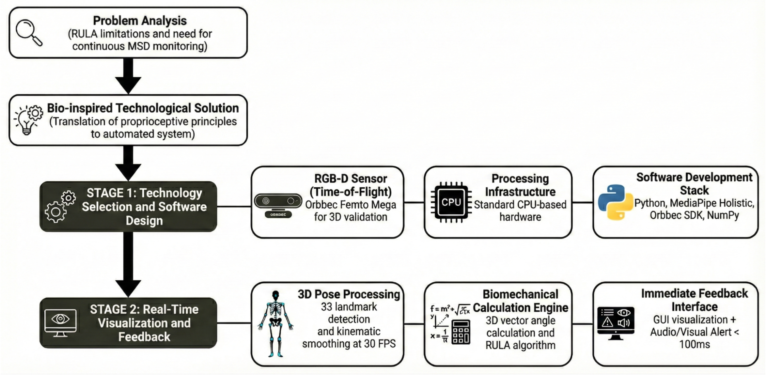 Workflow for monitoring tool development. The first stage begins with the analysis of the problem of musculoskeletal disorders (MSDs). It was observed that forced postures and repetitive movements generate a cumulative negative impact that compromises worker health. At an organizational level, this problem transcends individual health, resulting in high operating costs due to increased absenteeism, lost workdays, and reduced productive efficiency. Literature and operational environment analyses identified that the most prevalent injuries are concentrated in the upper body: back, neck, and shoulders, as well as in the tendinous and nervous units of the forearm and wrist. Based on this diagnosis, the second stage focused on creating a technological tool designed to serve as objective support for expert judgment. To this end, 2 key sub-stages were configured: (1) selection of necessary technology for monitoring software design and programming, and (2) real-time visualization capable of processing human posture and providing immediate feedback.