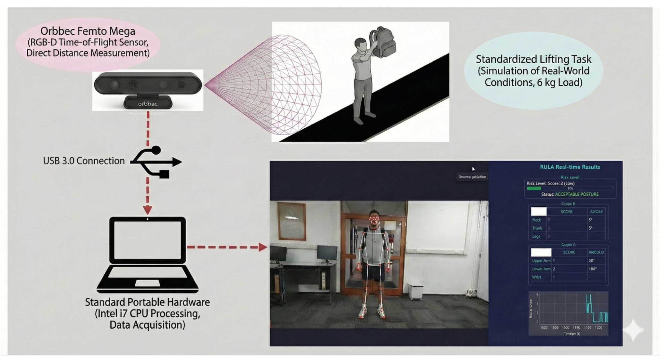 | V. Ergonomic Evaluation | Calculated angles are input into the rules engine (RULA tables) to obtain the risk score (Score 1 to 7). | RULA Rules Engine (Tables A, B, C) |