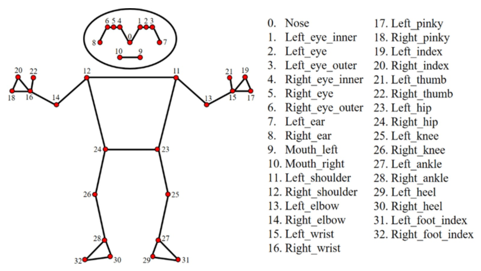 | II. Pose Detection | The computer vision algorithm identifies the subject and extracts 33 key skeletal landmarks in 3D coordinates (X, Y, Z). | Google MediaPipe Holistic (BlazePose) |