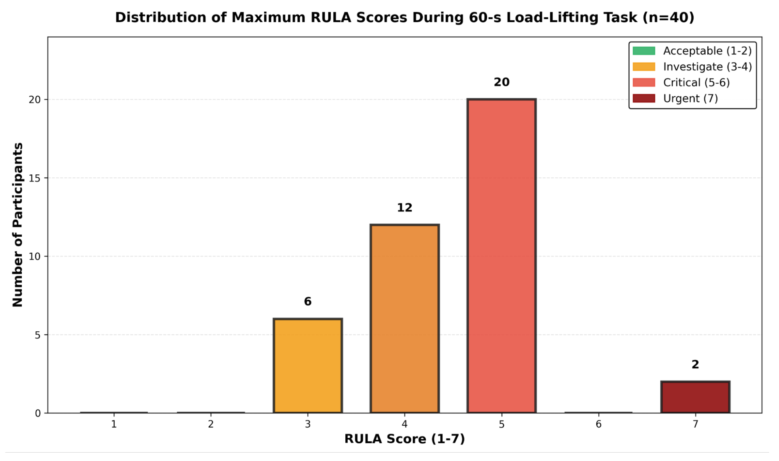 Histogram showing distribution of maximum RULA scores achieved by each participant () during 60 s load lifting tasks. X-axis: RULA score (1–7); Y-axis: frequency (participant count). Color coding: green (Scores 1–2, ), yellow (Scores 3–4, ), orange (Scores 5–6, ), and red (Score 7, ). This demonstrates a risk concentration in the 5–6 range, with 95% of participants achieving scores . This distribution emphasizes that dynamic task execution induces systematic postural risk across the anthropometric spectrum.