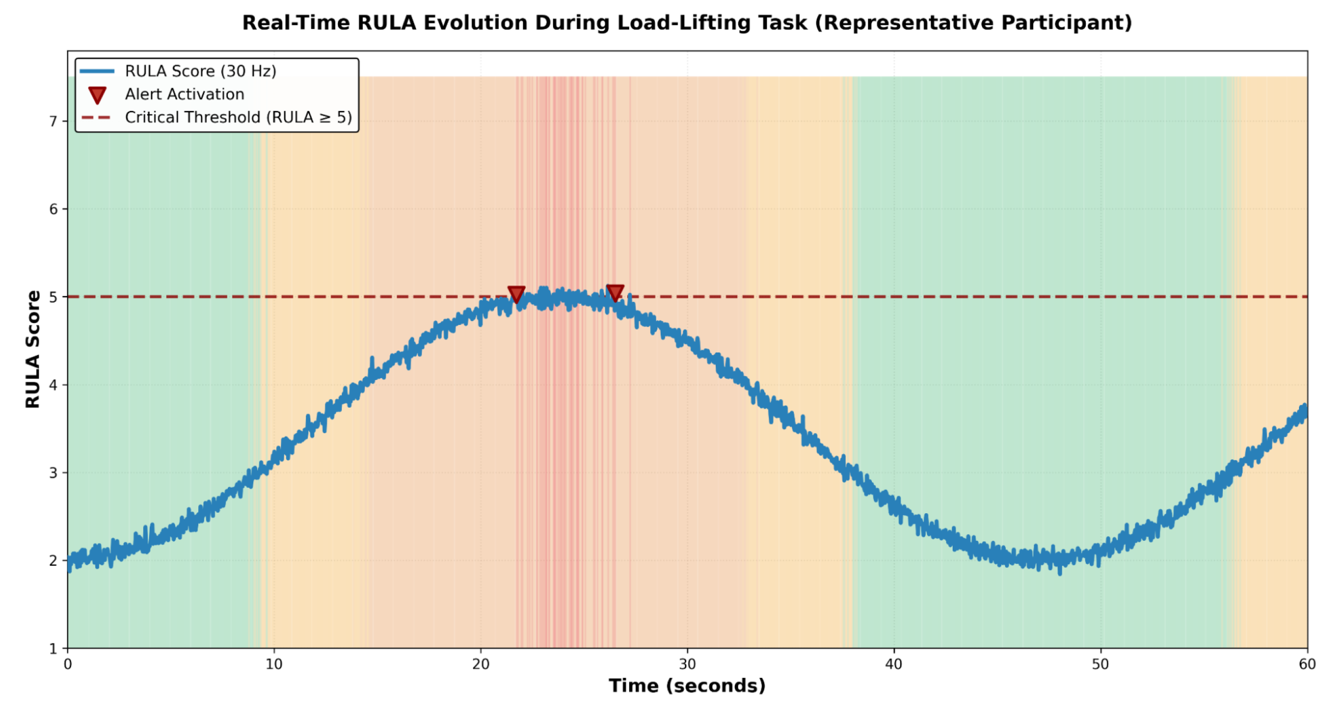 Representative time series plot of RULA score trajectory during execution of 60 s load lifting task. X-axis: Time (seconds); Y-axis: RULA score (1–7). Solid blue line shows RULA score calculated at 30 Hz sampling frequency (1800 data points per participant). Red vertical markers indicate audio alert activation events. Shaded regions: green (<3, acceptable), yellow (3–4, investigate), orange (5–6, changes needed), and red (≥7, urgent). Visible task phases: (0–5 s) initiation/acceleration phase with score elevation, (5–35 s) maximum load showing multiple alert events, (35–50 s) sustained elevation, and (50–60 s) recovery phase. For this representative participant, 18 distinct alert events triggered during 1840 ms of cumulative RULA > 5 time, demonstrating continuous monitoring sensitivity. Demonstrates close temporal correspondence between calculated risk and alert activation.