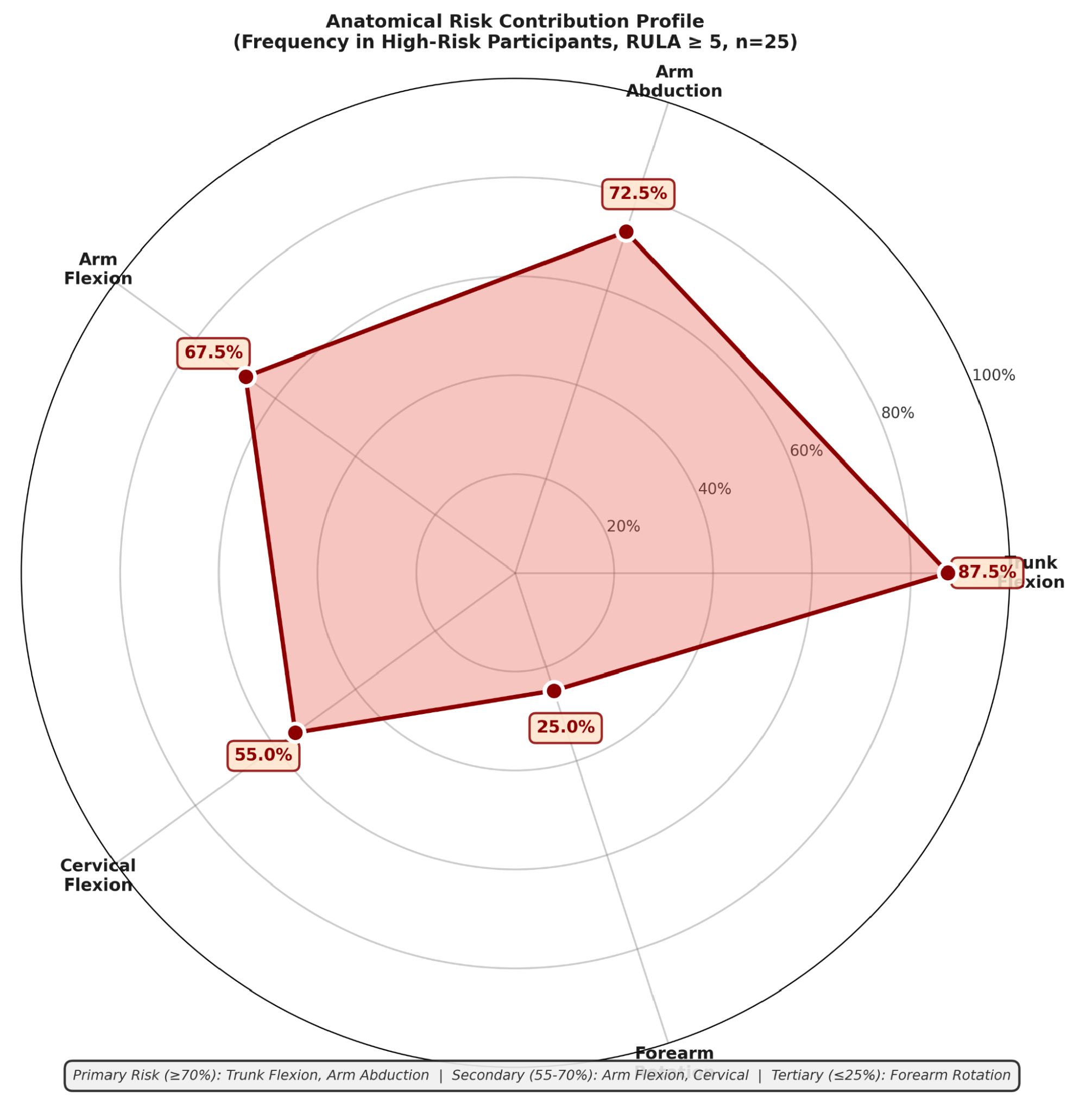 Radar/spider chart showing relative contribution of anatomical segments to postural risk. Representation of six axes: Trunk Flexion, Arm Abduction, Arm Flexion, Cervical Flexion, Forearm Rotation, and overall risk severity. Data points represent percentage of high-risk participants () where each segment contributed significantly to critical classification. Expected values: Trunk 87.5%, Arm Abduction 72.5%, Arm Flexion 68%, Cervical 55%, Forearm 25%. Shaded region bounded by connecting percentages reveals anatomical risk profile. Trunk flexion emerges as dominant contributor, indicating workstation redesign should prioritize vertical task positioning to reduce forward bending.