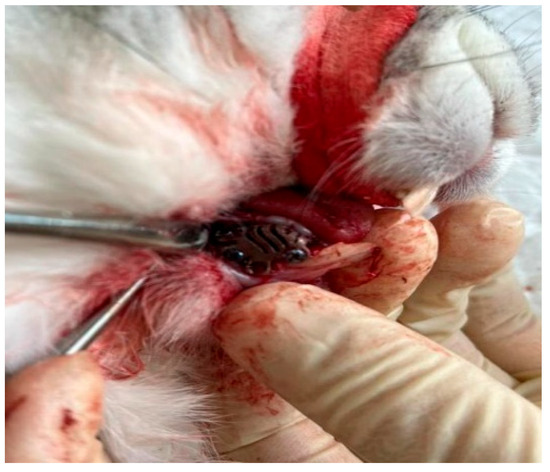 View of the rabbit’s oral cavity three months after inserting titanium mesh.