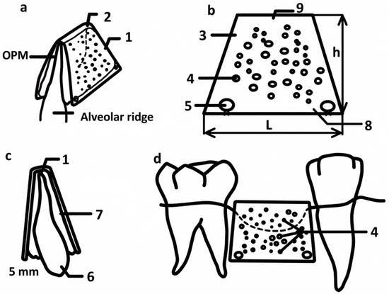 Drawing of a model of an individual titanium mesh in various projections: (a) an isometric view of the relative position of the device, the bone-plastic material and the alveolar ridge; (b) a view of the lateral trapezoidal face of the frame plate, made with an arbitrary arrangement of holes; (c) an additional view of the relative position of the device, the bone-plastic material and the alveolar ridge; (d) a view of the relative position of the device and teeth in any area of the jaw. 1—Lamellar curved frame, 2—upper base of the frame plate, 3—lateral trapezoidal face of the frame plate, 4—holes (diameter from 0.2 mm to 0.5 mm) on the side faces of the plate, 5—holes for mounting fixing screws , 6—alveolar ridge, 7—osteoplastic material (OPM), 8—lower base of the lateral trapezoidal face of the frame plate, 9—upper base of the lateral trapezoidal face of the frame plate, h—height of the defect, and L—width of the intervention zone.