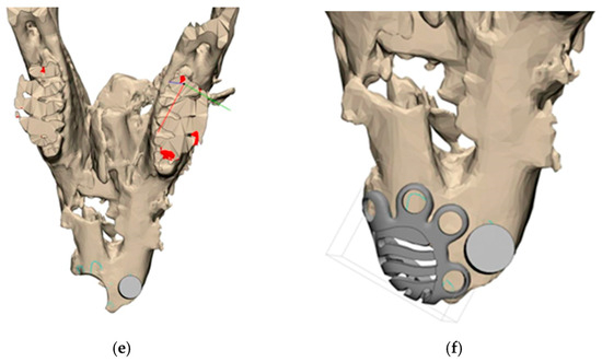 Creation of a virtual model of the defect and an individual titanium mesh to eliminate the defect based on the results of CBCT of the rabbit mandible: (a) the CT scan of the rabbit’s head; (b) the view of the rabbit’s lower jaw in the 3D-Materialise planning program; (c) highlighting the area of interest on the lower jaw; (d) creating and modeling an individual titanium mesh in the area of interest on the lower jaw, taking into account the future defect; (e) modeling the defect on the lower jaw; and (f) checking the compliance of the designed individual titanium mesh defect on the rabbit’s lower jaw.