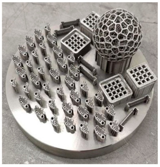 View of an individual titanium mesh after it is printed on a 3D printer. Printed individual meshes are located in the left inner part of the platform.